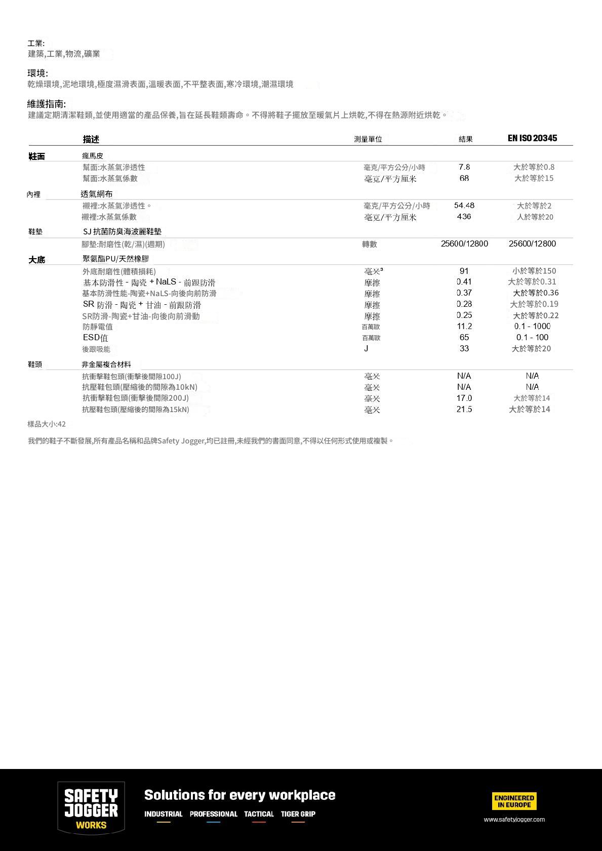 SAFETY JOGGER ALTAR S3 MID 011329 多用途中筒拉鍊安全靴,具備卓越的防護與舒適性能。其採用SR防滑設計與耐熱大底,確保在濕滑及高溫環境下的安全行走。鞋面由防水透氣皮革製成,搭配無金屬複合鞋頭,輕盈且適合頻繁通過金屬探測器的專業人士。橡膠外底耐油、耐燃料及化學品,不留痕跡。可拆的鞋墊可與矯正鞋墊搭配使用,後跟與前腳掌的能量吸收設計,有效減少身體衝擊,緩解姿勢性疼痛,減少腳部出汗。符合S3S SR SC LG ESD HI CI FO HRO等安全標準,為建築、物流、礦業等多產業理想選擇。