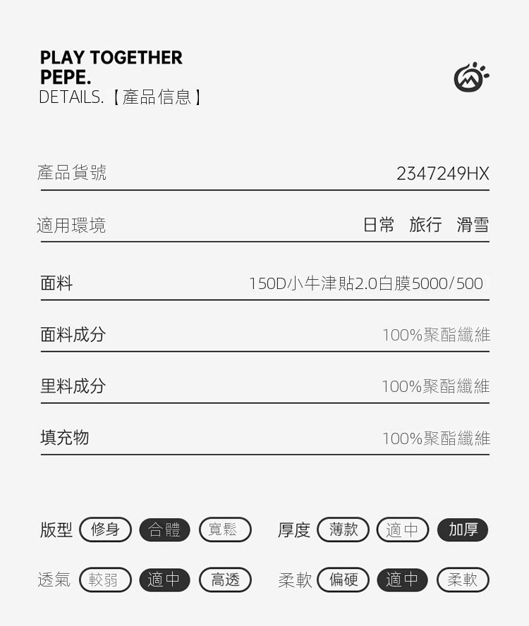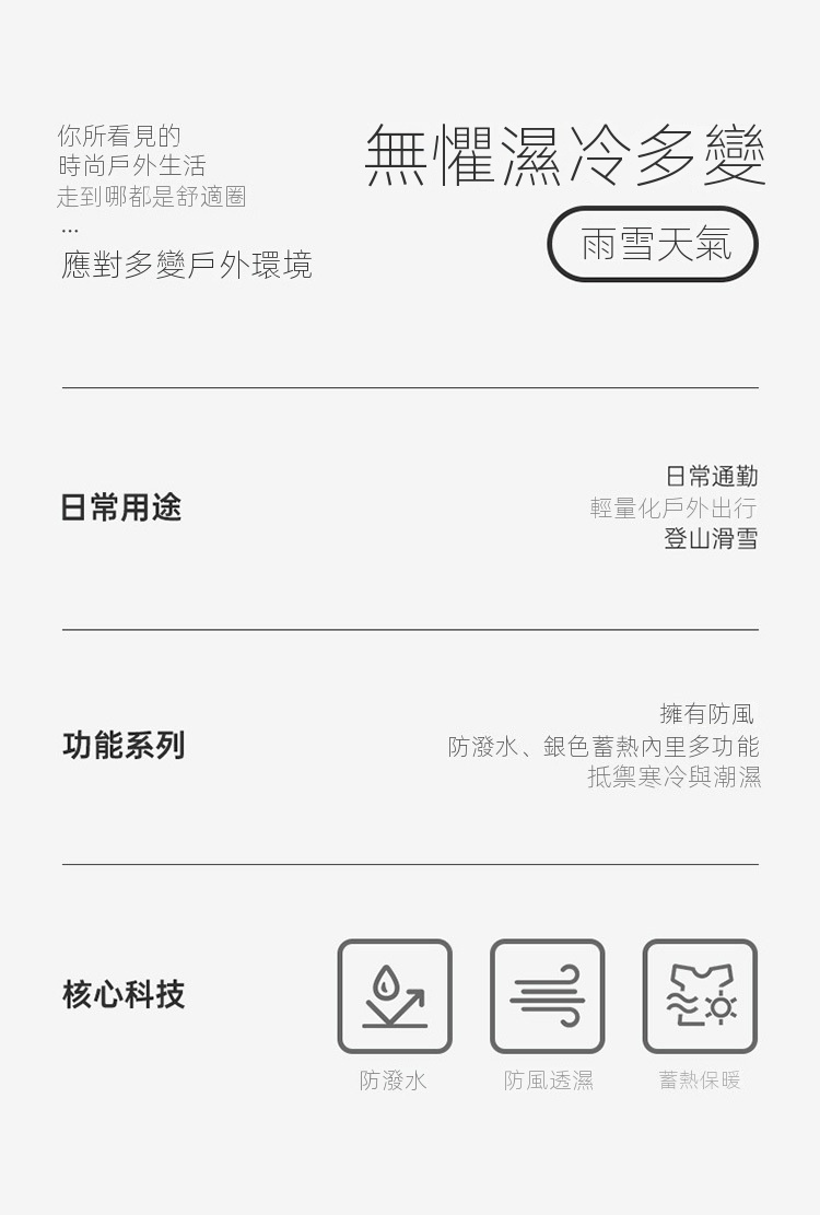 • 防潑水面料:專業防潑水技術,確保在多變天候下也能維持乾爽狀態,適合全天候穿著。