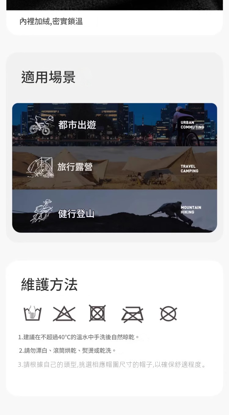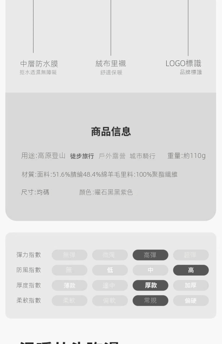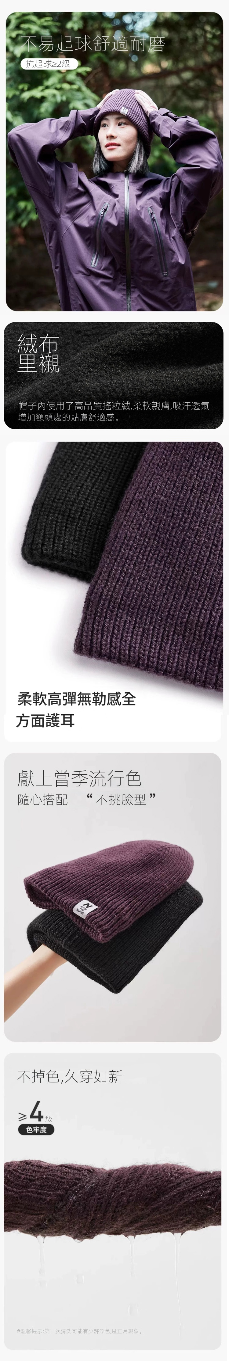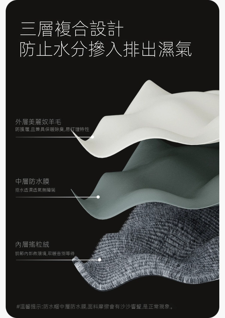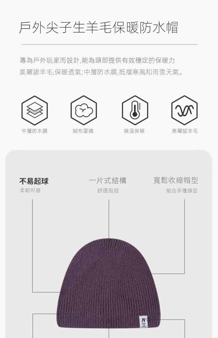 Naturehike防水針織冷帽專為戶外活動設計,採用美麗諾羊毛與防水膜三層結構。外層羊毛防護兼保暖除臭,中層防水透濕,內層搖粒絨調節溫度,提供卓越的保暖性和透氣性。一片式寬鬆設計,柔韌耐磨,適配多種頭型。材質包含腈綸、綿羊毛及聚酯纖維,具備防風、透濕功能,適合-5℃至-15℃環境使用。此款黑色冷帽不僅防寒,還具備抗起球、不掉色等優點,易於打理且可機洗,是高原登山、露營或城市騎行的理想選擇。