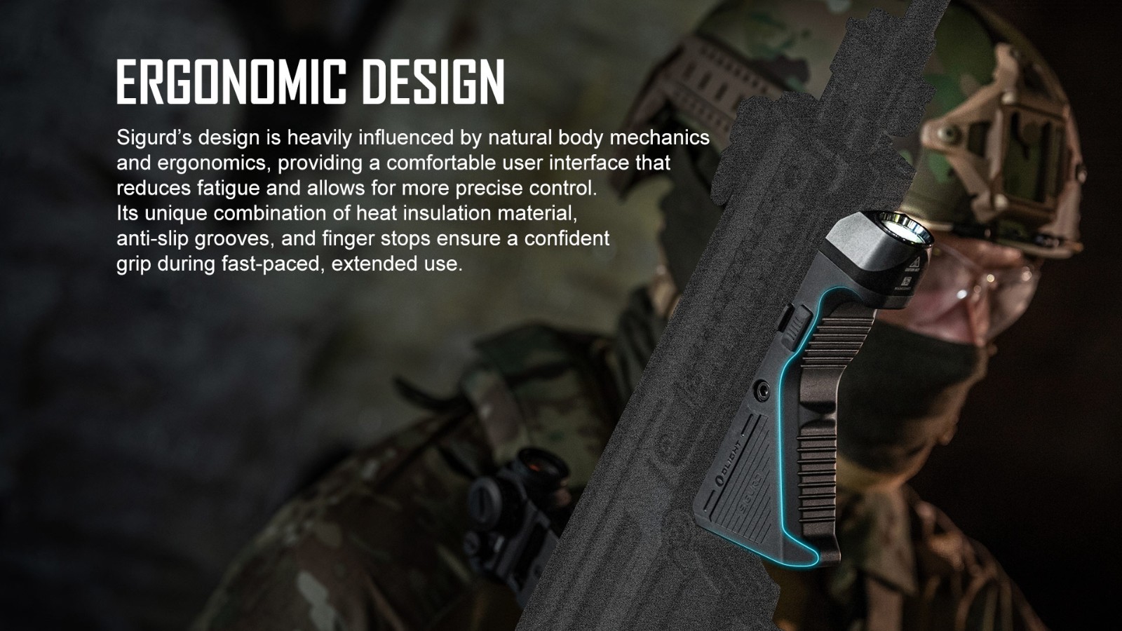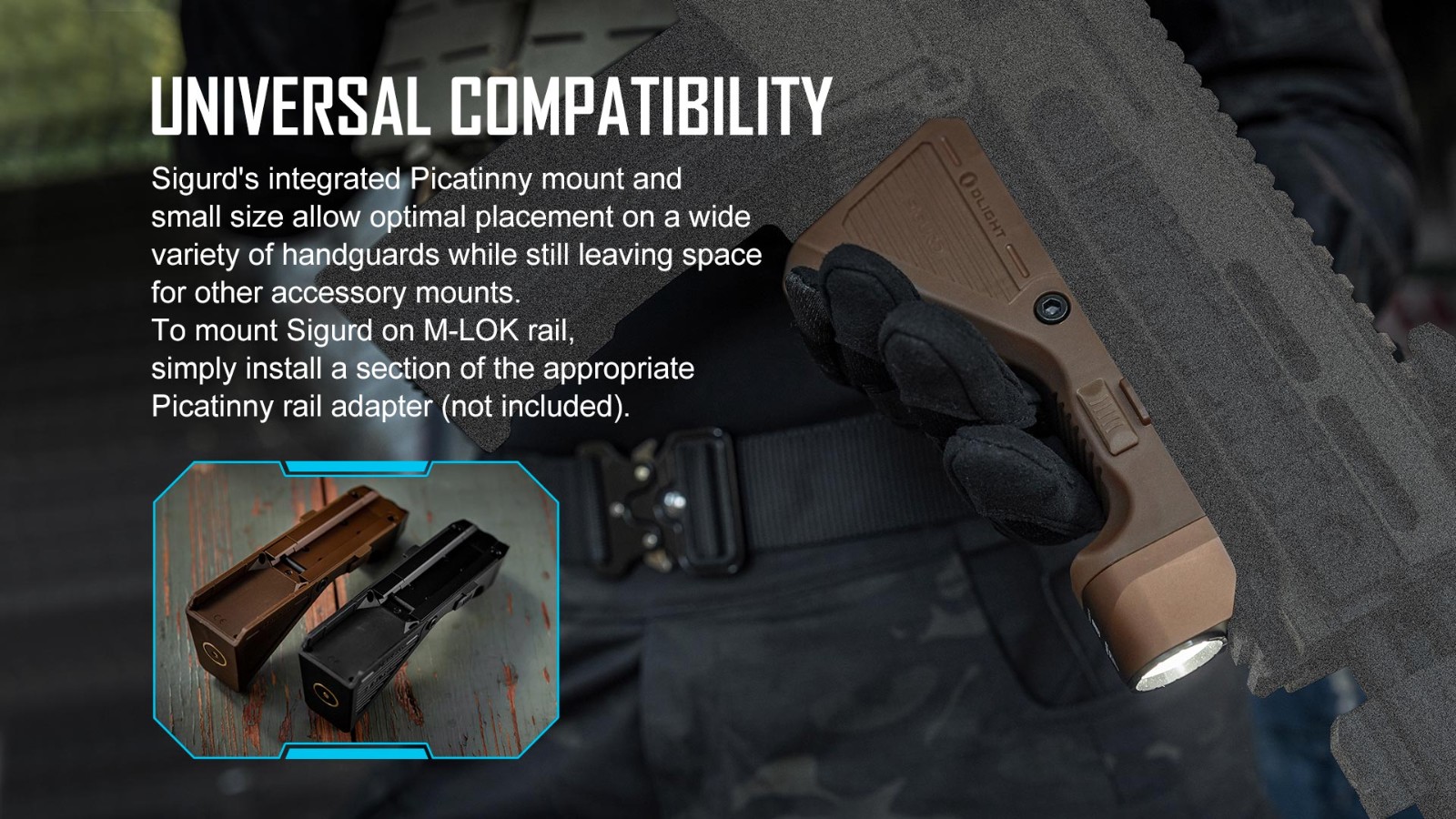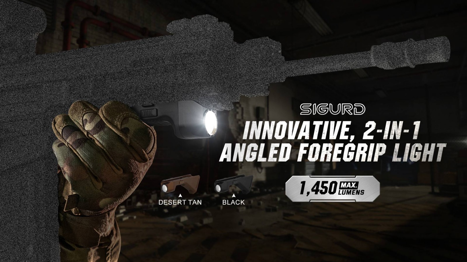 OLIGHT Sigurd三角握把戰術電筒,創新採用二合一設計,將符合人體工學的三角握把與強大戰術燈相結合,防滑凹槽和手指擋塊確保握持穩固,還能隔絕筒身熱量。性能卓越,擁有290流明和1450流明亮度模式,最大射程達240米,遠近照明皆出色。標準鋁合金皮卡汀尼導軌安裝便捷,裝上轉接器後也能適應M-LOK導軌。操作輕鬆,雙手皆可方便開關及切換亮度。內建2400mAh可充電鋰聚合物電池,使用MCC-1A USB磁吸充電線充電,為各類戰術場景提供可靠照明。