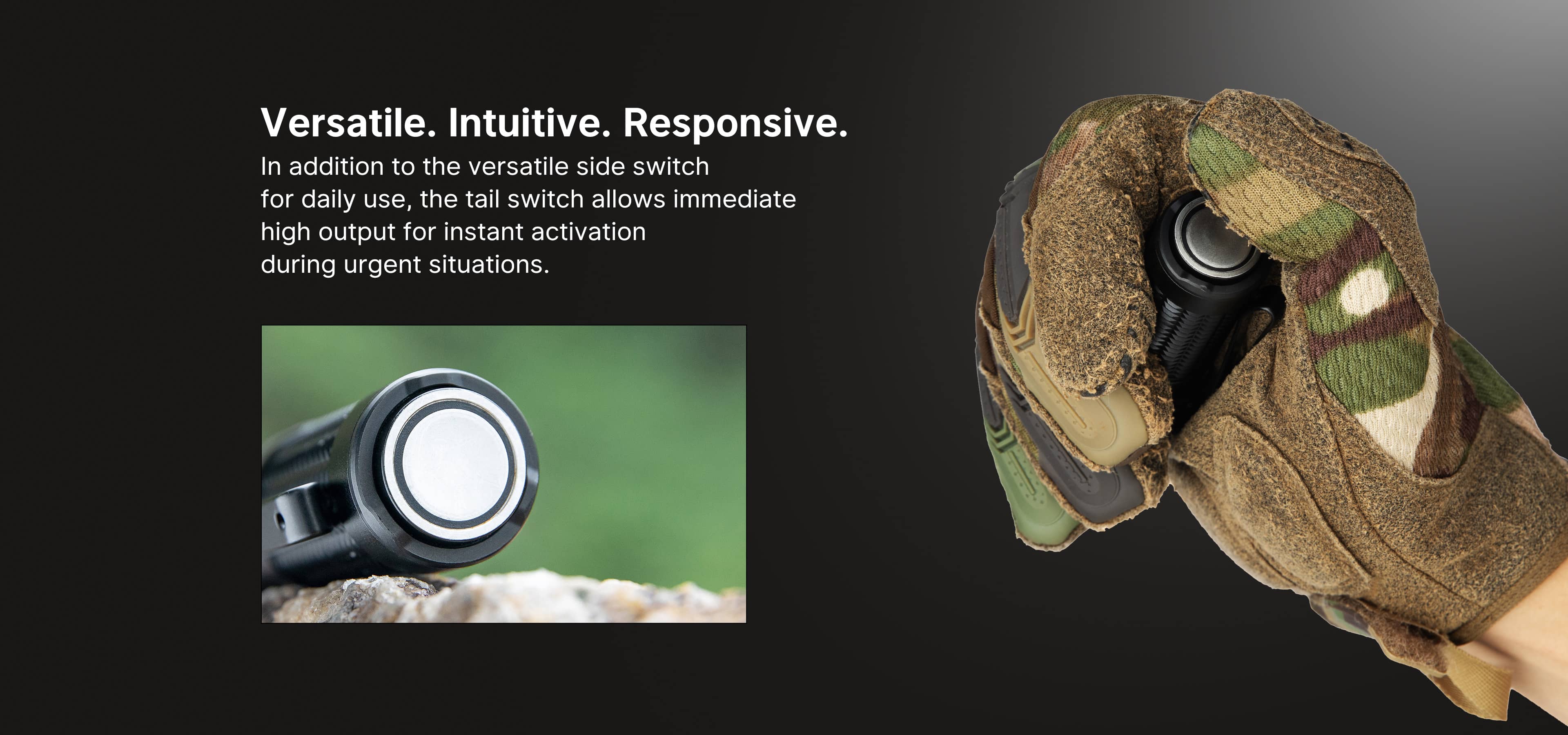 • EDC 和戰術雙開關:Nano 配備側邊和尾部開關,適用於日常和戰術場景。其尾部開關設計更大、更無縫,可提供更精確的輕敲/重擊回饋。