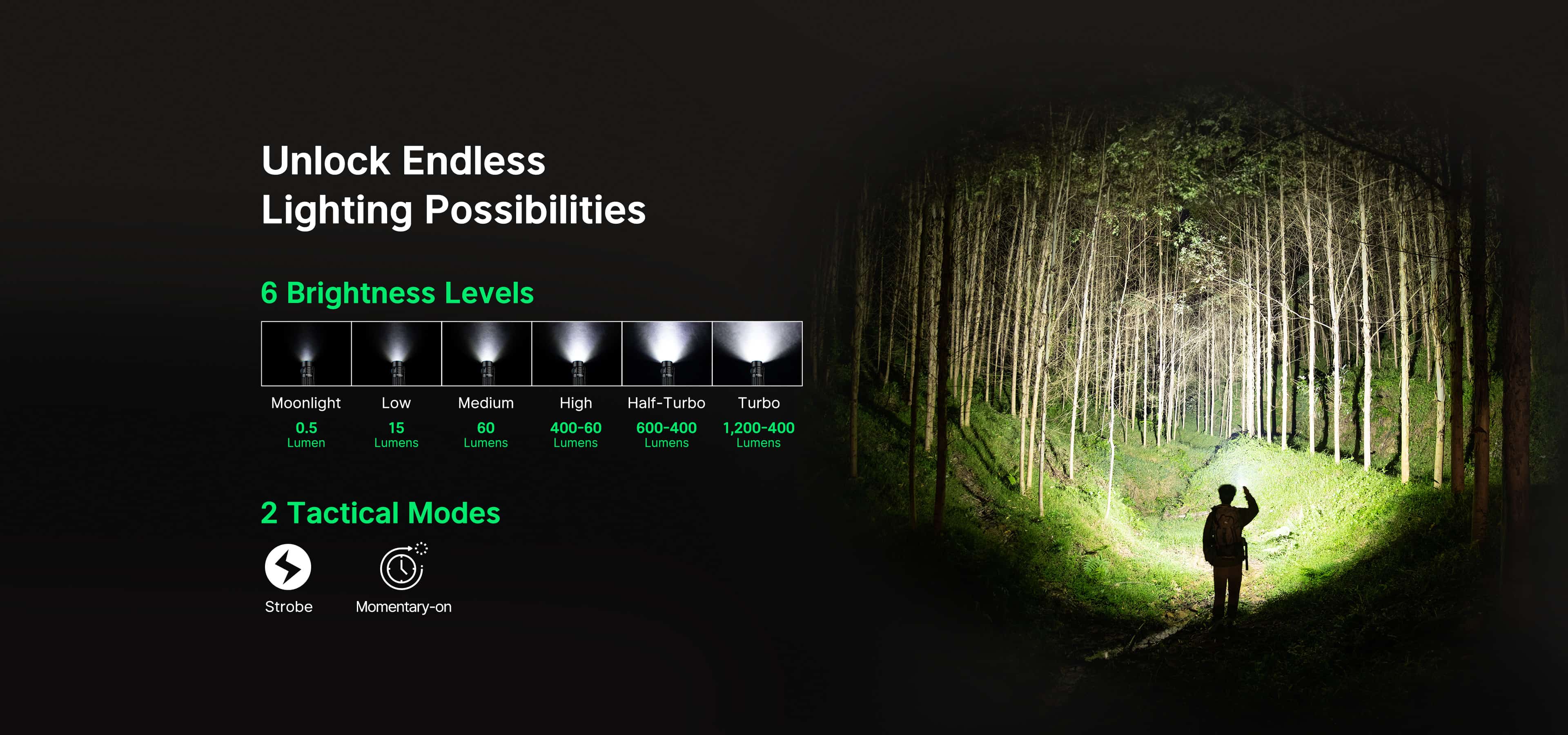 • 2 + 6 種燈光選項:Warrior Nano 具有常規和頻閃模式,具有六種亮度級別,包括 Turbo、Half-Turbo、高、中、低和月光。