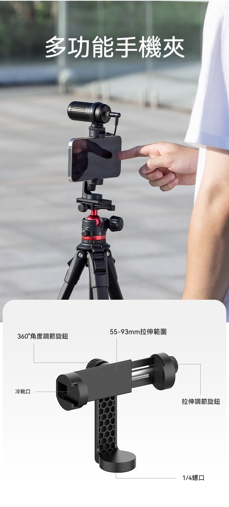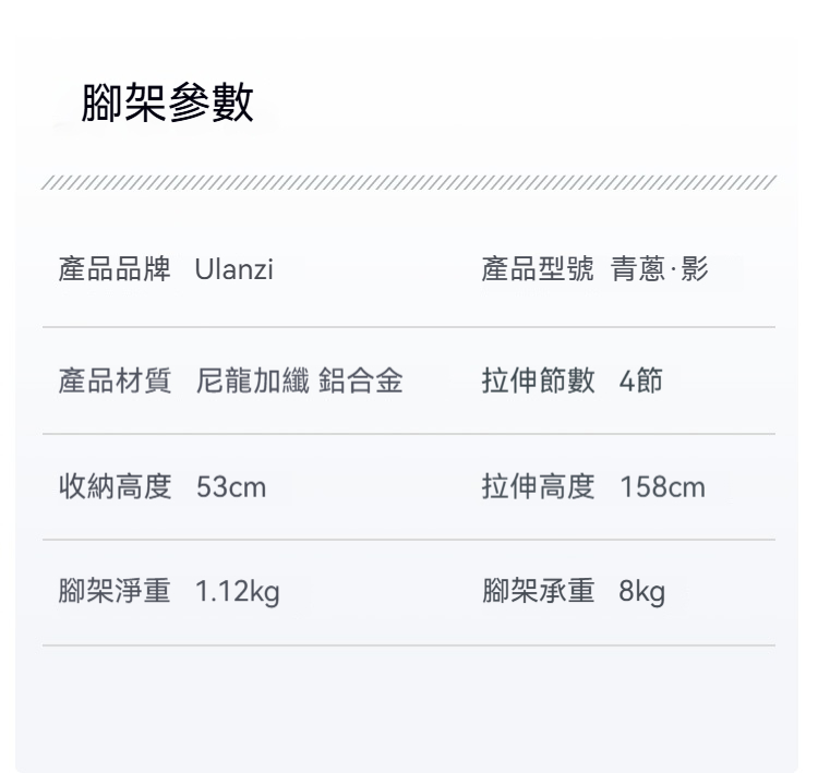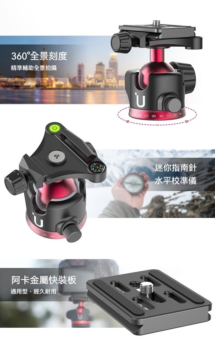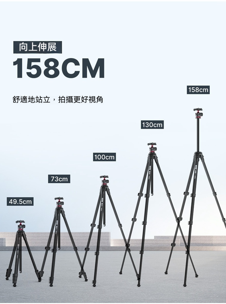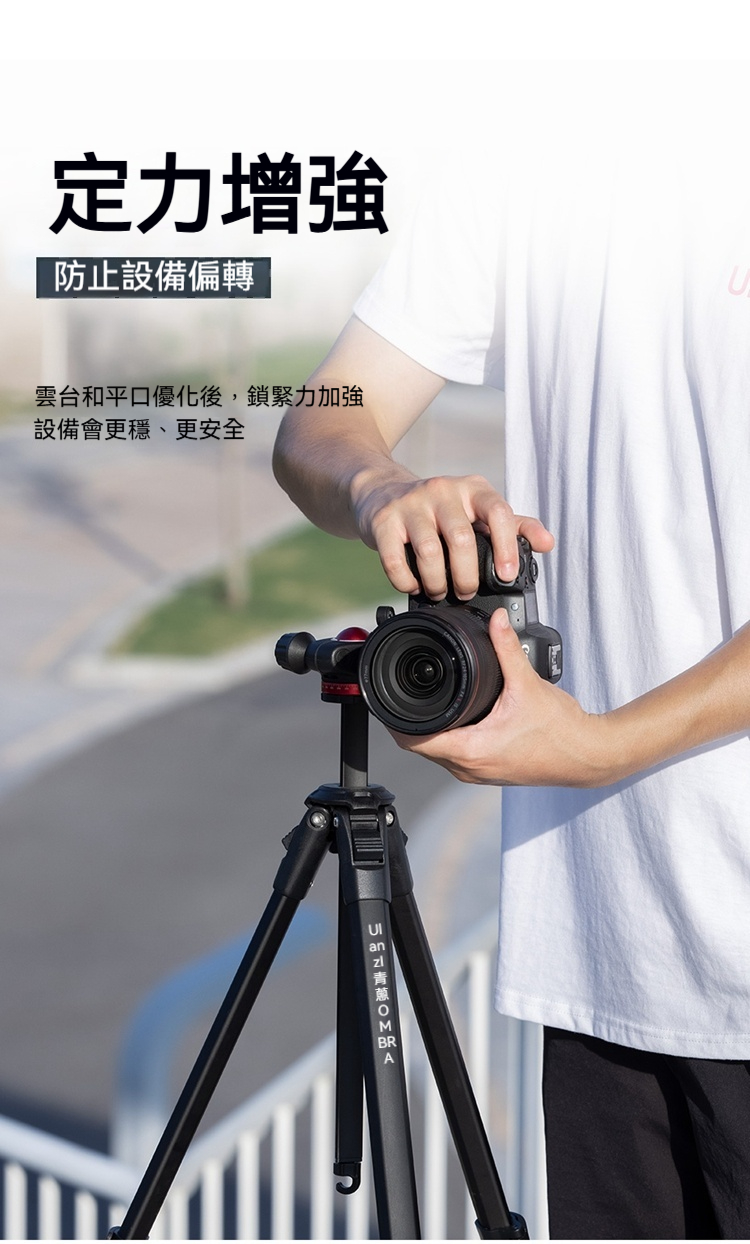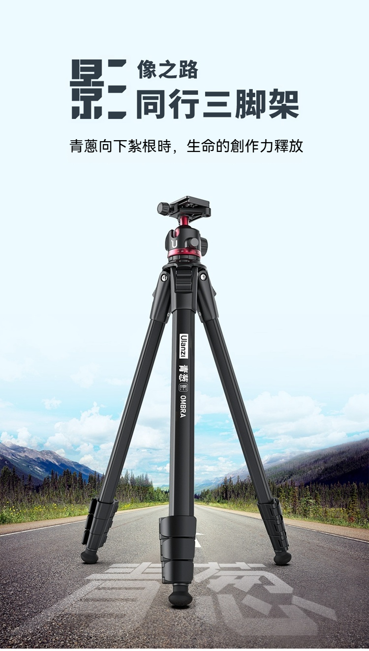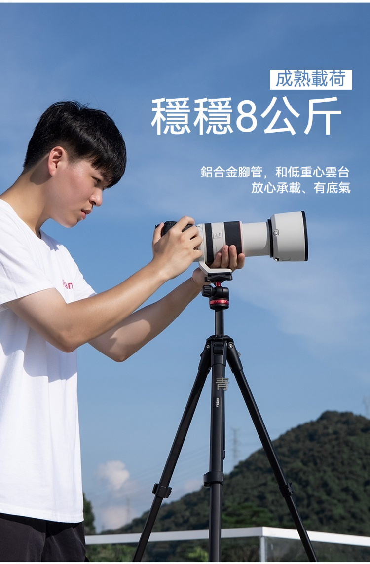 Ulanzi青蔥·影鋁合金板扣球頭雲台三腳架,是攝影新手的得力助手。它採用鋁合金材質,僅重1.12kg,堅固且輕巧,女生也能輕鬆攜帶 。 4節腳管設計,收納長度53cm,拉伸後最高至1.58m,扣環操作簡單,可快速收放。腳架承重8kg,穩定性佳。 360°可旋轉球頭雲台有全景刻度,方便調整拍攝角度。還附贈手機架,相機、手機拍攝都適配。無論是日常風景記錄,還是旅行跟拍,它都能滿足需求,性價比超高 。