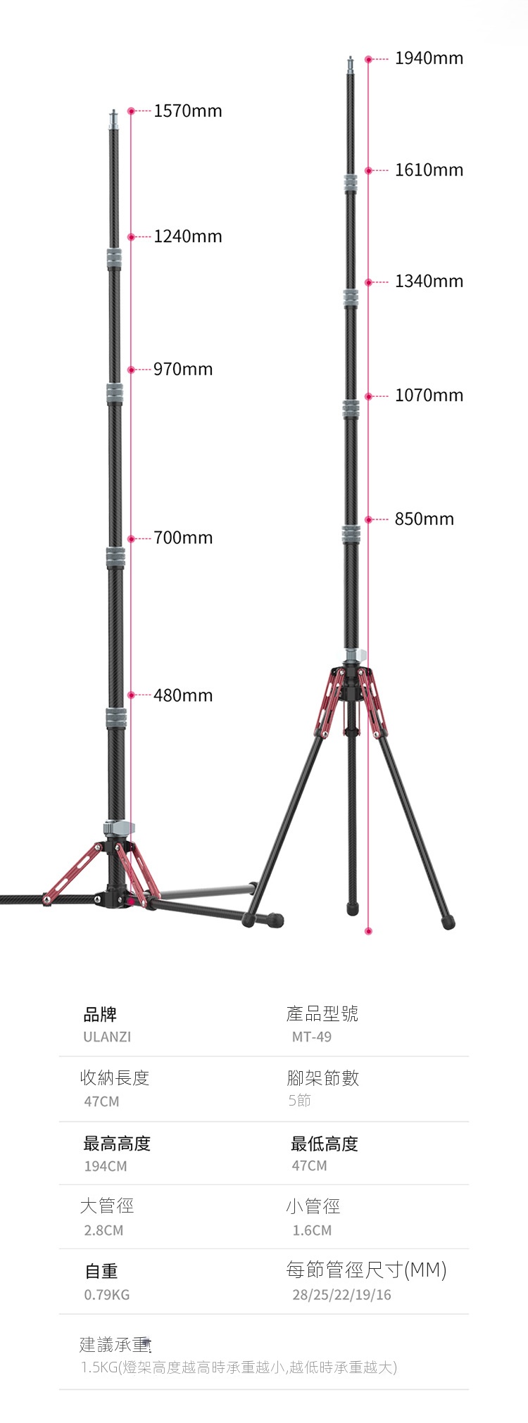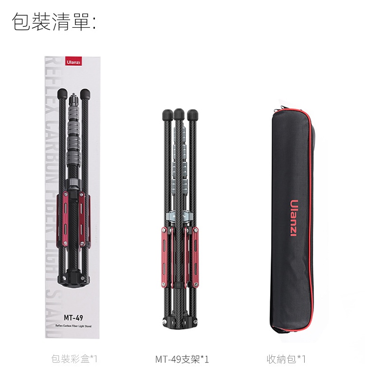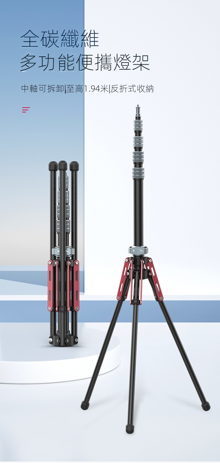 Ulanzi MT-49 1.9M反折碳纖維燈架,專為攝影愛好者和專業人士打造。採用8層碳纖維材質,堅固耐用且重量僅0.79kg,方便攜帶。最大管徑達28mm,搭配全新旋鈕鎖,僅需1/4圈即可快速鎖定或解鎖。中軸可拆卸,瞬間變身為獨腳架或麥克風、手機等設備的延長桿。燈架最高可達1.94米,反折收納設計大幅縮小體積。底部橡膠腳套防滑耐磨,搭配便攜式收納袋,無論是戶外拍攝還是室內影棚使用,都能輕鬆應對,為各類補光設備提供穩定可靠的支撐 。