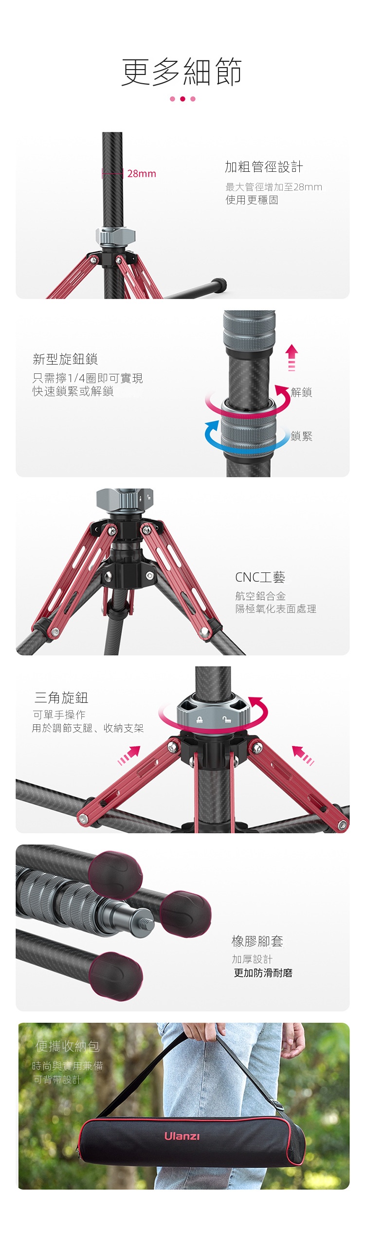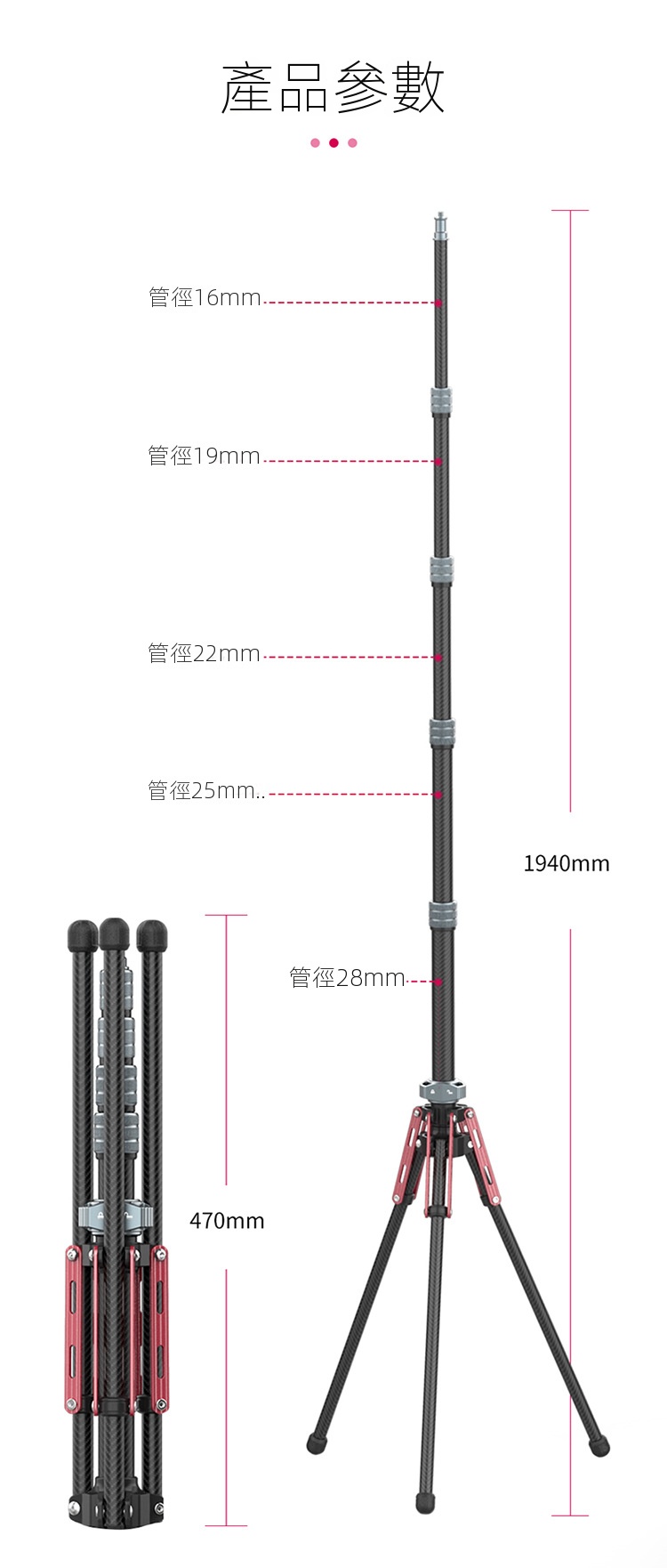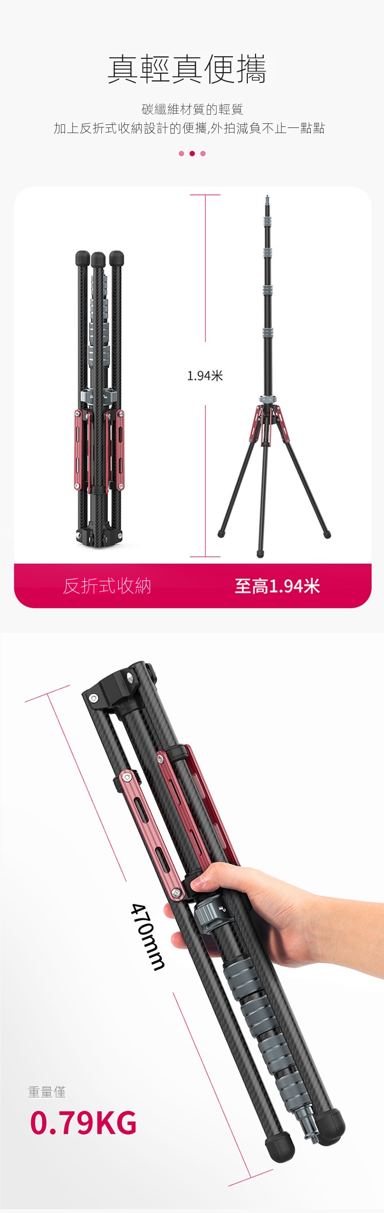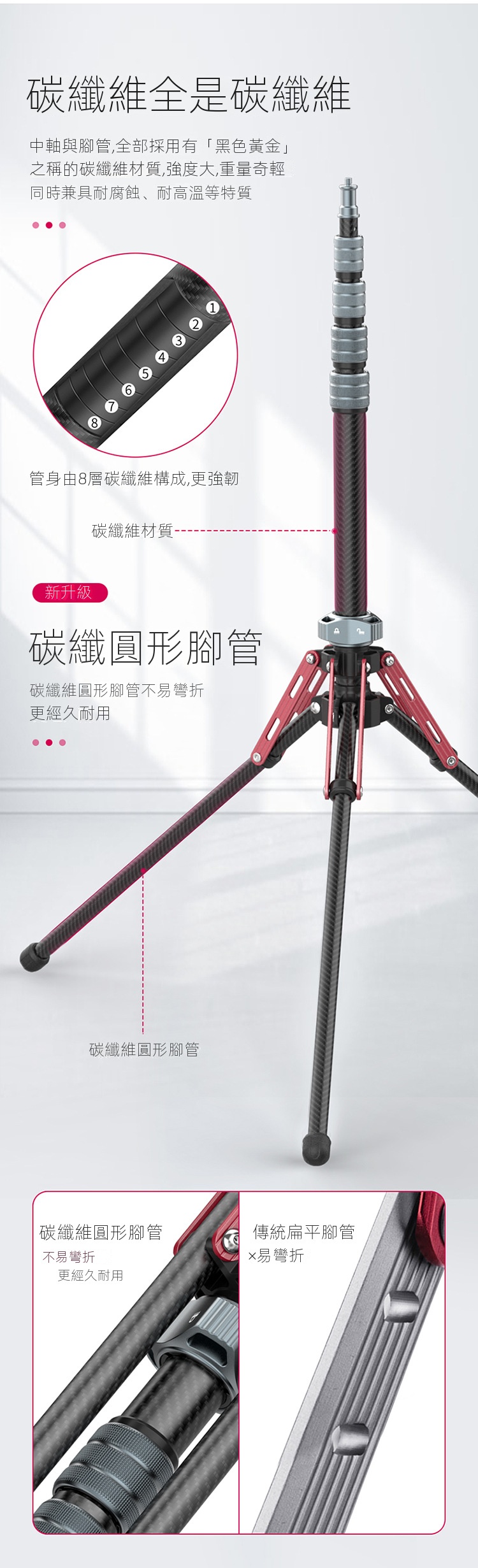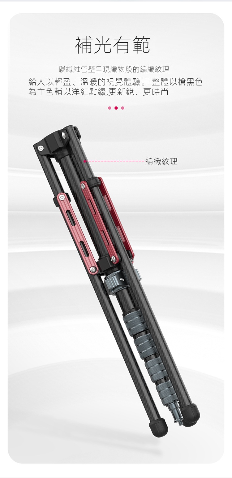 • 碳纖維圓形腳管,提供更好的穩定性和耐用性