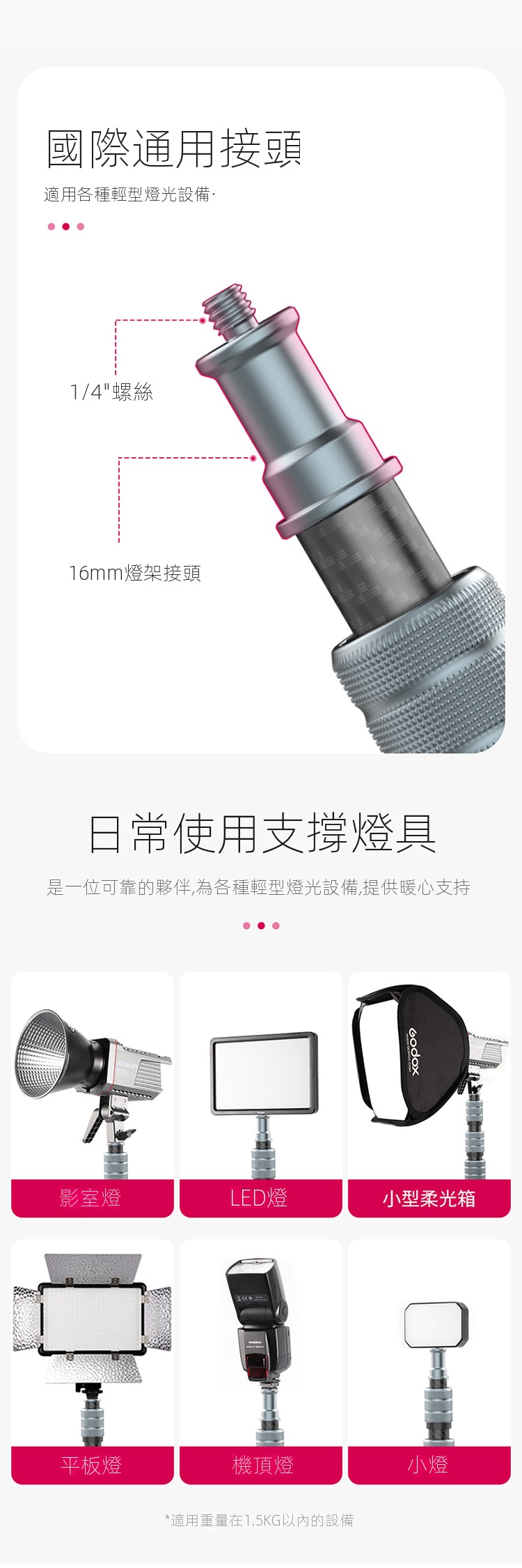 • 適用重量在1.5KG以內的設備,如影室燈、LED燈、平板燈、機頂燈等