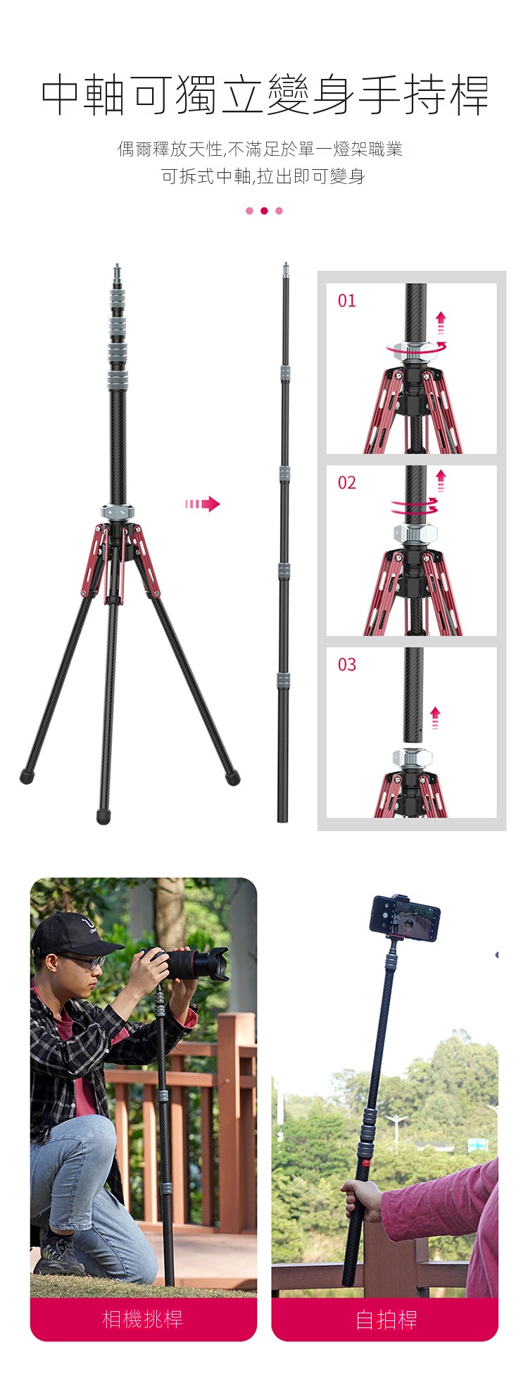• 中軸可拆卸,變身手持桿或自拍桿,多功能使用