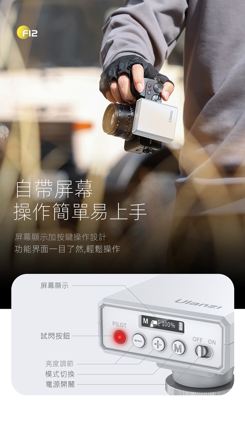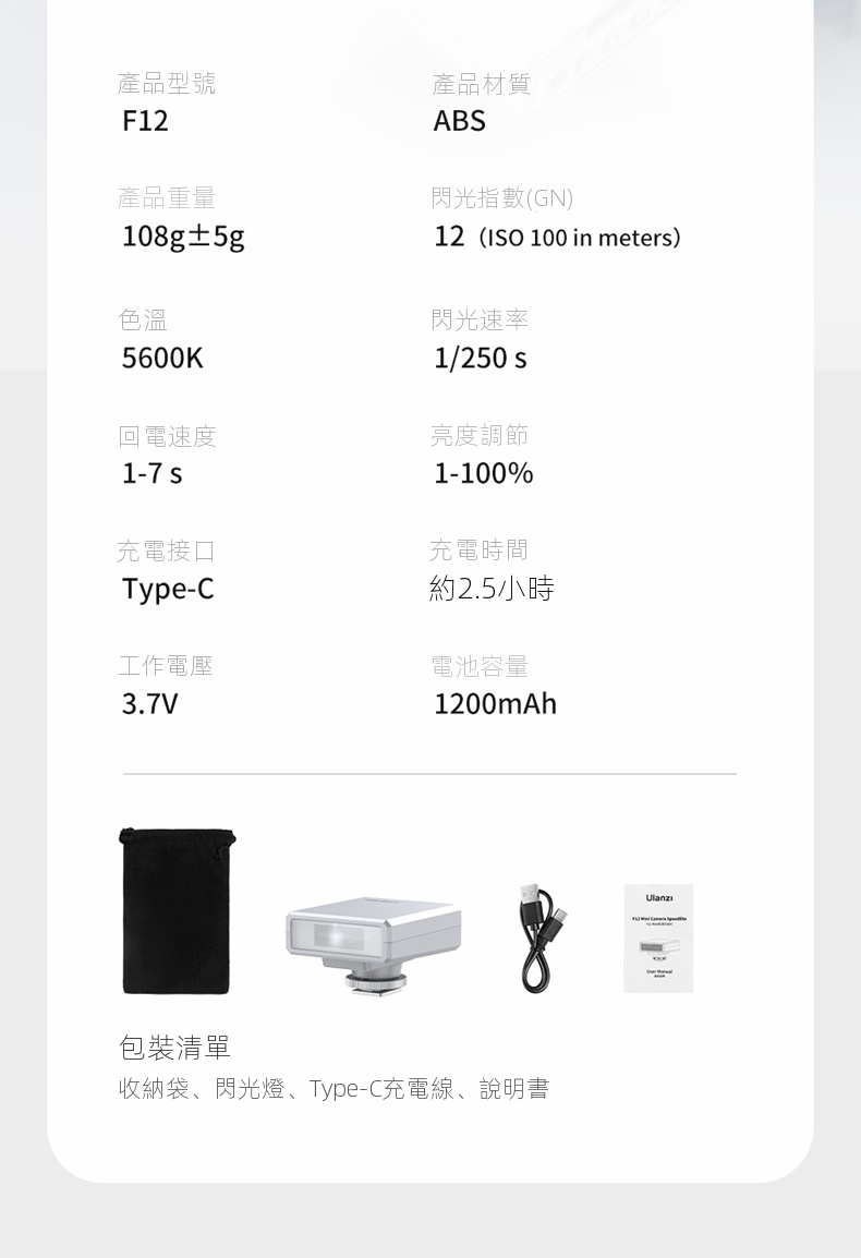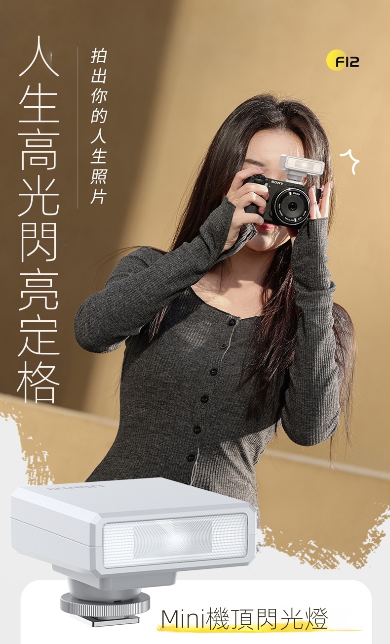 Ulanzi F12 Mini機上閃光燈,是攝影愛好者的得力助手。它小巧便攜,重量僅108g ,可輕鬆放進口袋,隨時隨地開啟拍攝。內建1200mAh電池,支援約110次閃光,還能用Type-C充電,方便快速。其閃光指數達GN12,官方閃光同步速率為1/250s,功率在1-100%間可調節,設有auto擋,新手也能輕鬆上手。它相容性強,適配索尼、佳能等多種相機品牌熱靴接口。搭配柔光罩,能柔化光線,減少陰影與反光,讓主體更自然,無論是日常記錄或專業創作都適用。
