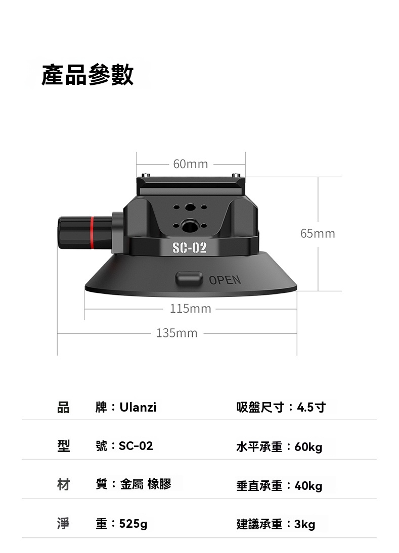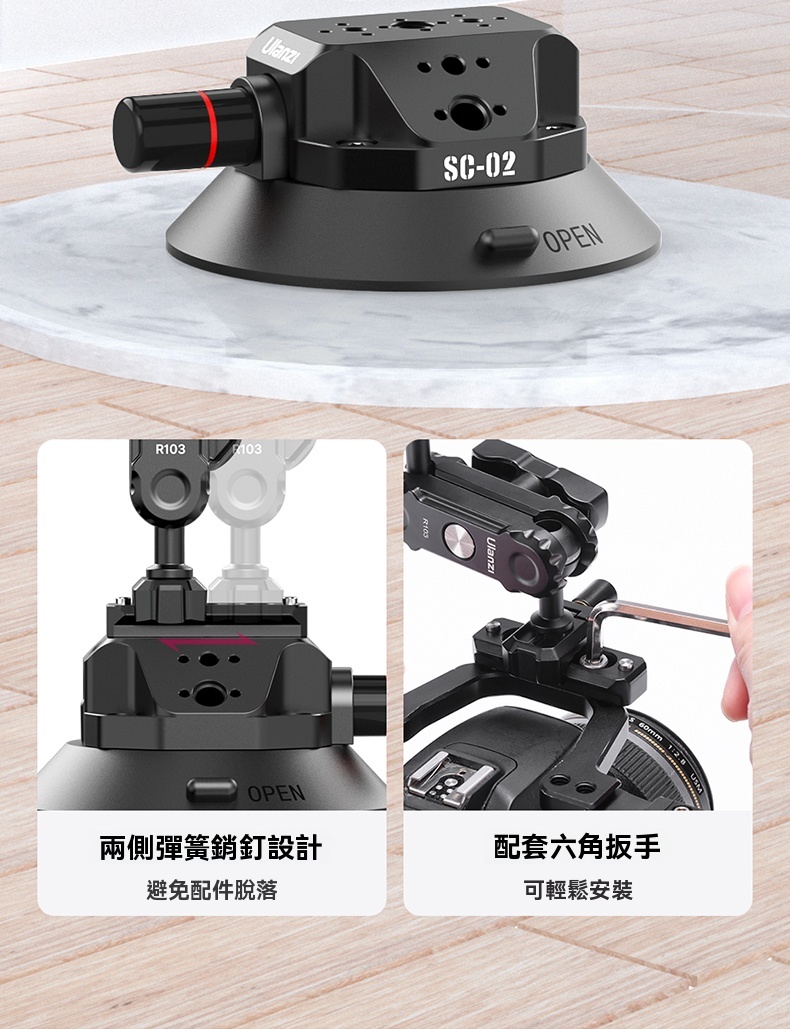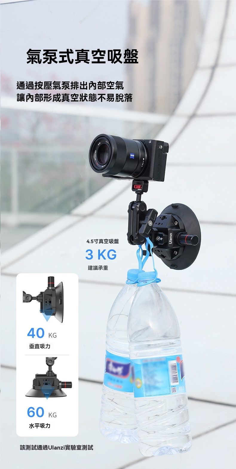 Ulanzi SC-02 4.5吋多拓展真空吸盤,是實用的拍攝輔助配件。它採用優質丁腈橡膠吸盤,吸附力強,能穩固在多種光滑表面,如車窗、玻璃等,適用於多種場景拍攝。 4.5吋尺寸適中,兼顧吸附穩定性與彈性。擁有多拓展接口,可外接雲台、相機、補光燈等設備,滿足多樣化創作需求。安裝、拆卸便捷,能快速調整拍攝位置與角度。無論是記錄旅途風景,還是創作創意視頻,都能為拍攝帶來便利,讓你輕鬆獲得穩定且獨特的畫面。