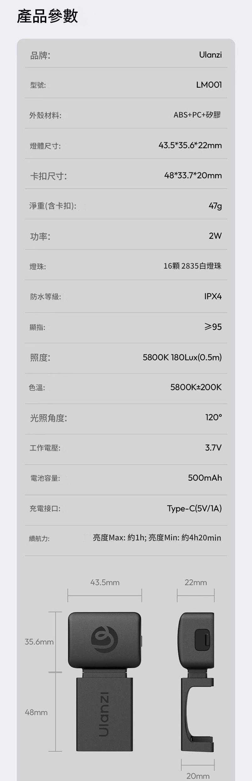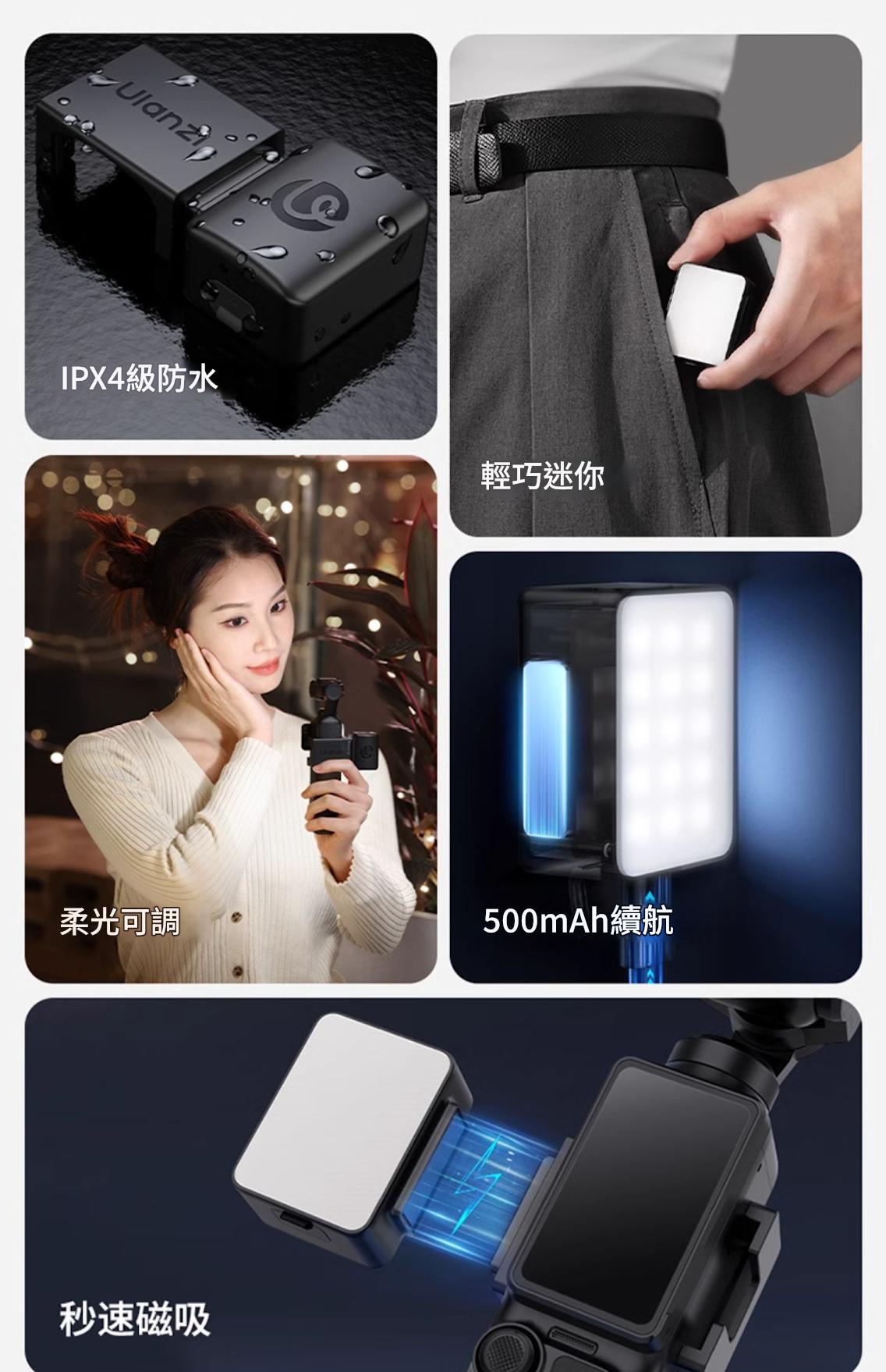 Ulanzi LM001 Pocket3磁吸補光燈,是拍攝愛好者的得力助手。它功率達20W,遠超同類型小燈,能充分滿足日常拍攝補光需求。內建5000mAh電池,滿功率下續航30分鐘,也支援邊充電邊使用,搭配Type-C接口,70分鐘左右即可充滿電。機內配備智慧型控溫散熱風扇,長時間使用也不用擔心過熱。它具備雙色溫和RGB無極調整功能,輕鬆營造多元氛圍。標配磁吸柔光罩,吸附穩固且貼合。補光燈設有通用螺絲接口,可安裝在三腳架、燈架、相機熱靴口等,搭配贈送的多角度可調節轉接口,無論是補面光、側光,還是充當髮絲燈,都能出色完成任務 。