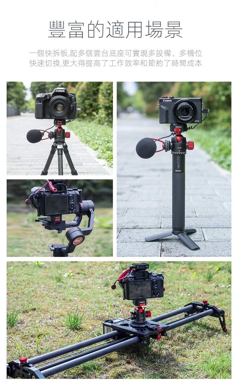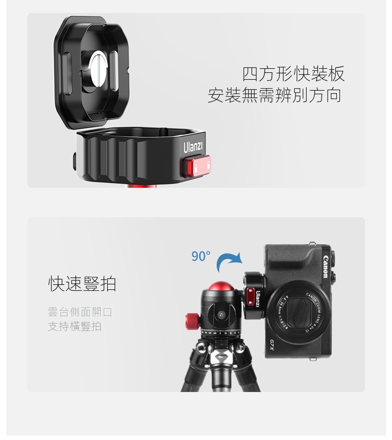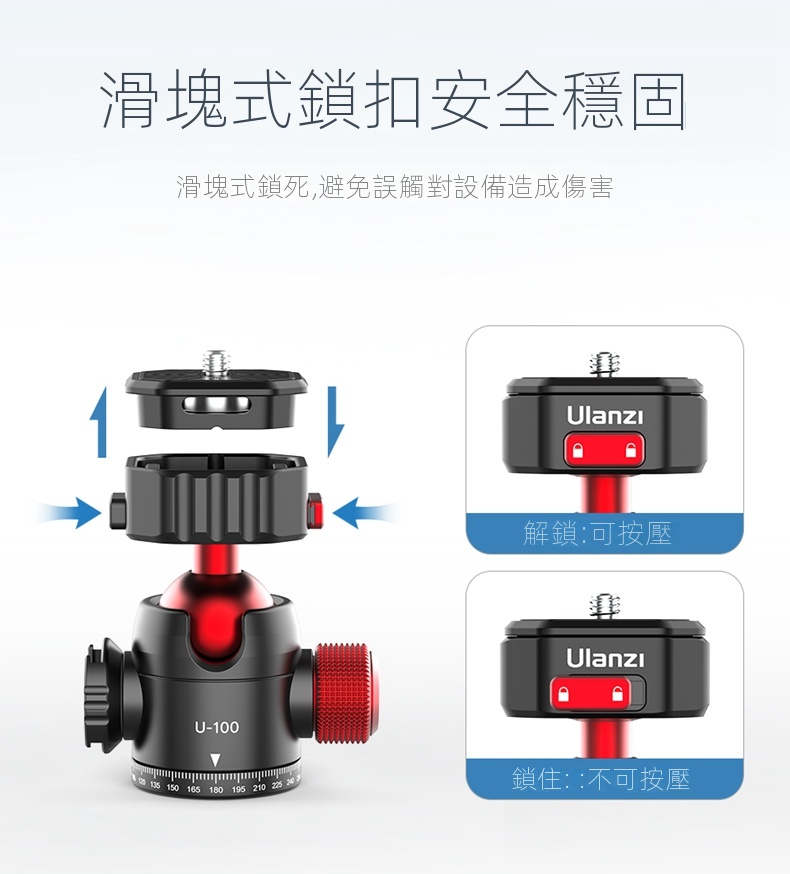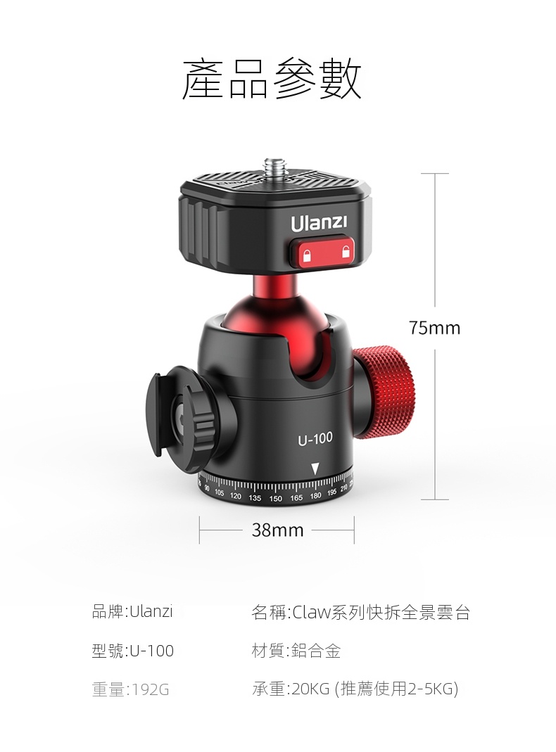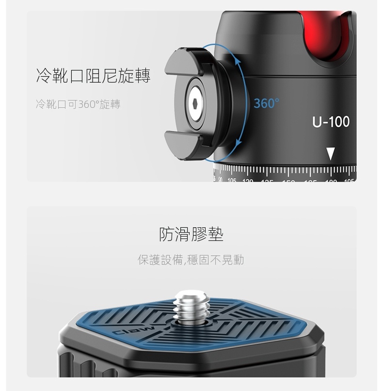 Ulanzi Claw系列快拆全景雲台(型號:U-100)是一款專為攝影愛好者設計的多功能雲台。採用全金屬CNC精密加工,具備強大的20KG承重能力,推薦使用2-5KG設備,確保穩定性與耐用性。雲台底部可實現360°全景調節,方便快速調整水平刻度,適合拍攝壯麗的全景作品。 獨創的快拆設計,搭配優藍子專利技術,實現了相機的快速拆裝,極大地提高了工作效率。側面冷靴設計解決了無處安放麥克風的問題,同時支持360°旋轉,靈活多變。滑塊式鎖扣設計確保設備安全穩固,避免誤觸損壞。 產品適用於多種場景,包括手持、三腳架、穩定器等,一個快拆板即可實現多設備、多機位的快速切換。此外,雲台配備防滑膠墊,保護設備不晃動,並提供3/8轉1/4螺絲轉接頭,兼容不同接口需求。整體設計貼心細緻,操作簡便,是專業攝影師和攝影愛好者的理想選擇。