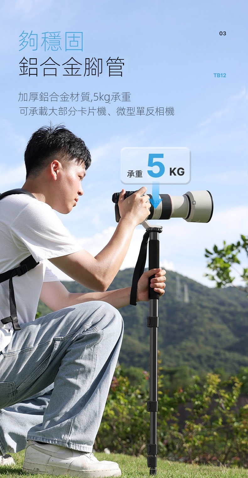 • 採用加厚鋁合金材質,承重能力達5公斤,穩定支撐大部分卡片機及微型單反相機。