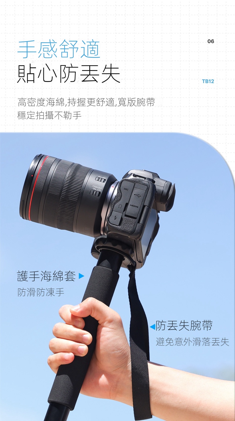 Ulanzi TB12 鋁合金單腳架是一款輕便易攜的專業攝影工具,專為追求高品質與靈活性的攝影愛好者設計。其採用加厚鋁合金材質,承重達5公斤,可穩固支撐大部分卡片機及微型單反相機,確保拍攝時的穩定性。 該單腳架擁有五節伸縮設計,高度可在43cm至155cm之間自由調整,滿足不同身高和場景需求。收納後僅43cm,重量約378克,輕巧便於隨身攜帶,甚至可放入20吋登機箱中,適合旅行或戶外使用。 產品配備雙頭螺絲設計,支援1/4"和3/8"標準規格,方便連接各種設備。握把部分採用高密度海綿包裹,提供舒適的手感,並配有寬版腕帶,防止意外滑落。此外,腳尖設計可插入地面,增加穩定性,同時也可作為登山杖或自拍杆使用,一物多用,極具實用性。 總體而言,Ulanzi TB12 不僅輕便耐用,還兼具多功能性和舒適性,是攝影愛好者和戶外活動者的理想選擇。