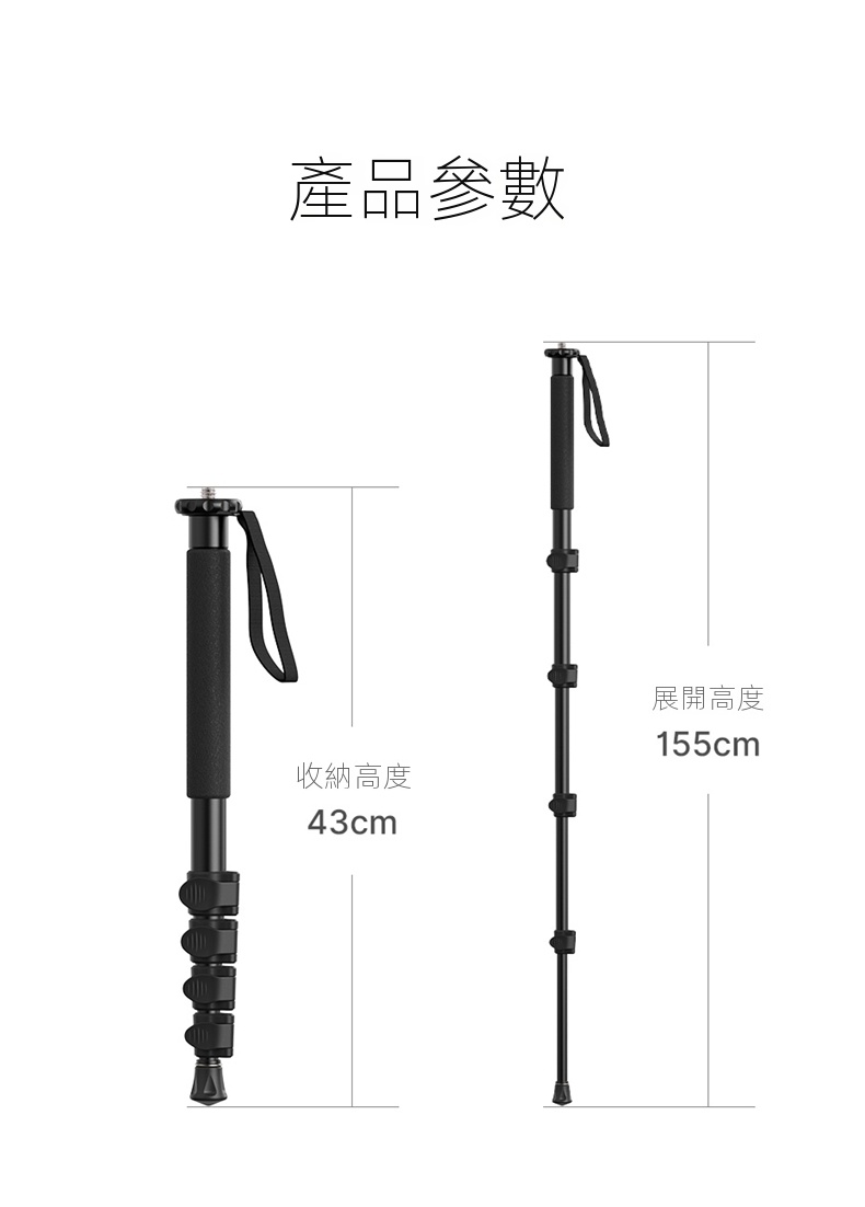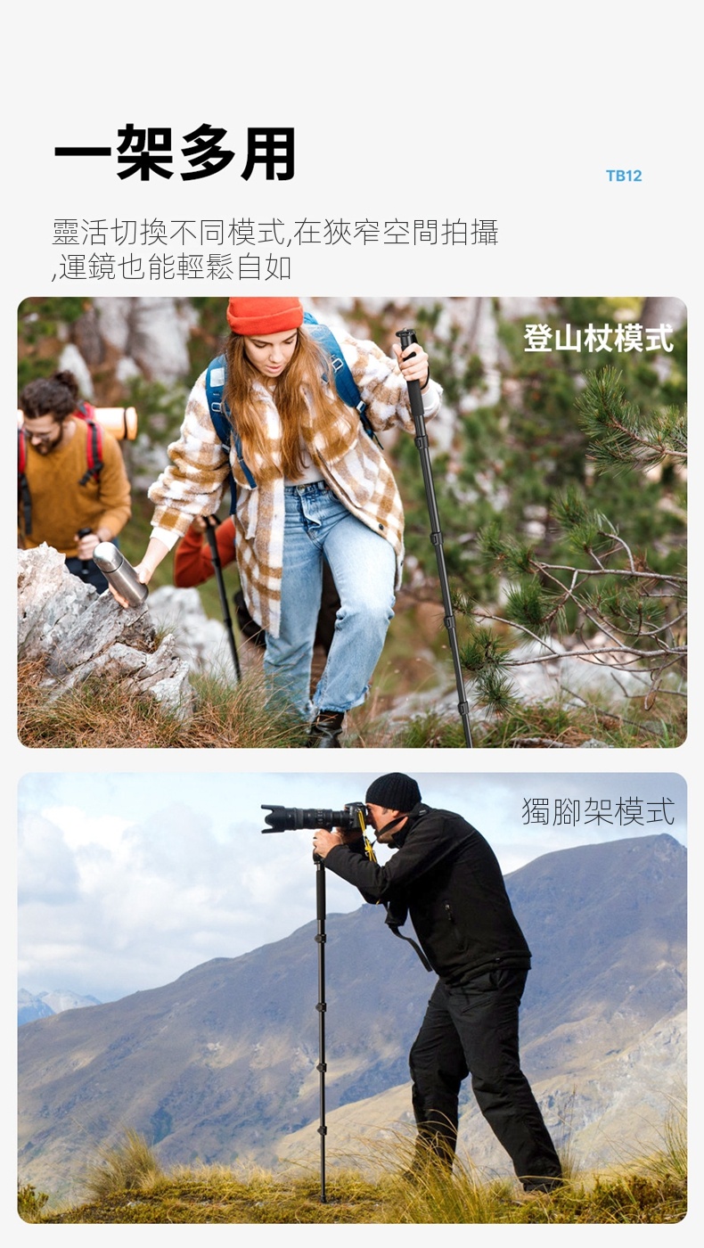 • 多功能設計,可作為單腳架、登山杖或自拍杆使用,一物多用。