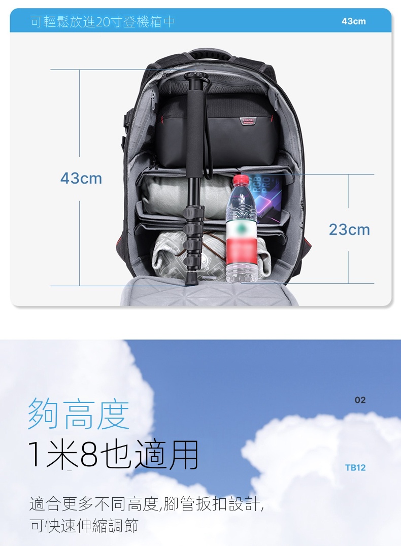 • 輕便易攜,重量僅約378克,收納後高度僅43厘米,可放入20吋登機箱中。