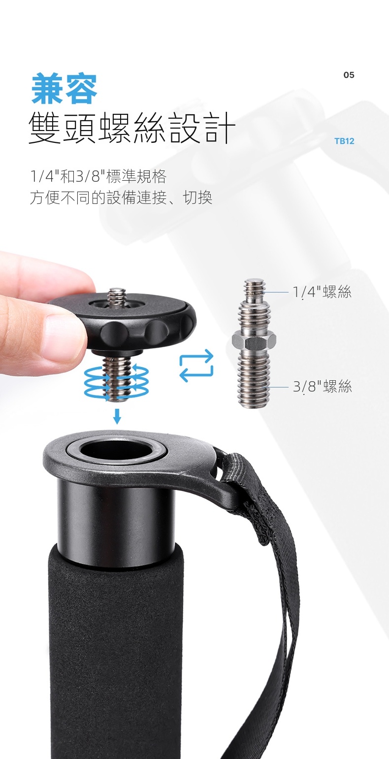 • 雙頭螺絲設計,支援1/4"和3/8"標準規格,方便連接各種設備。
