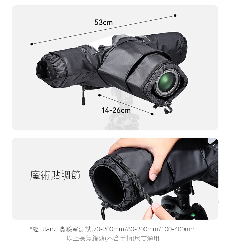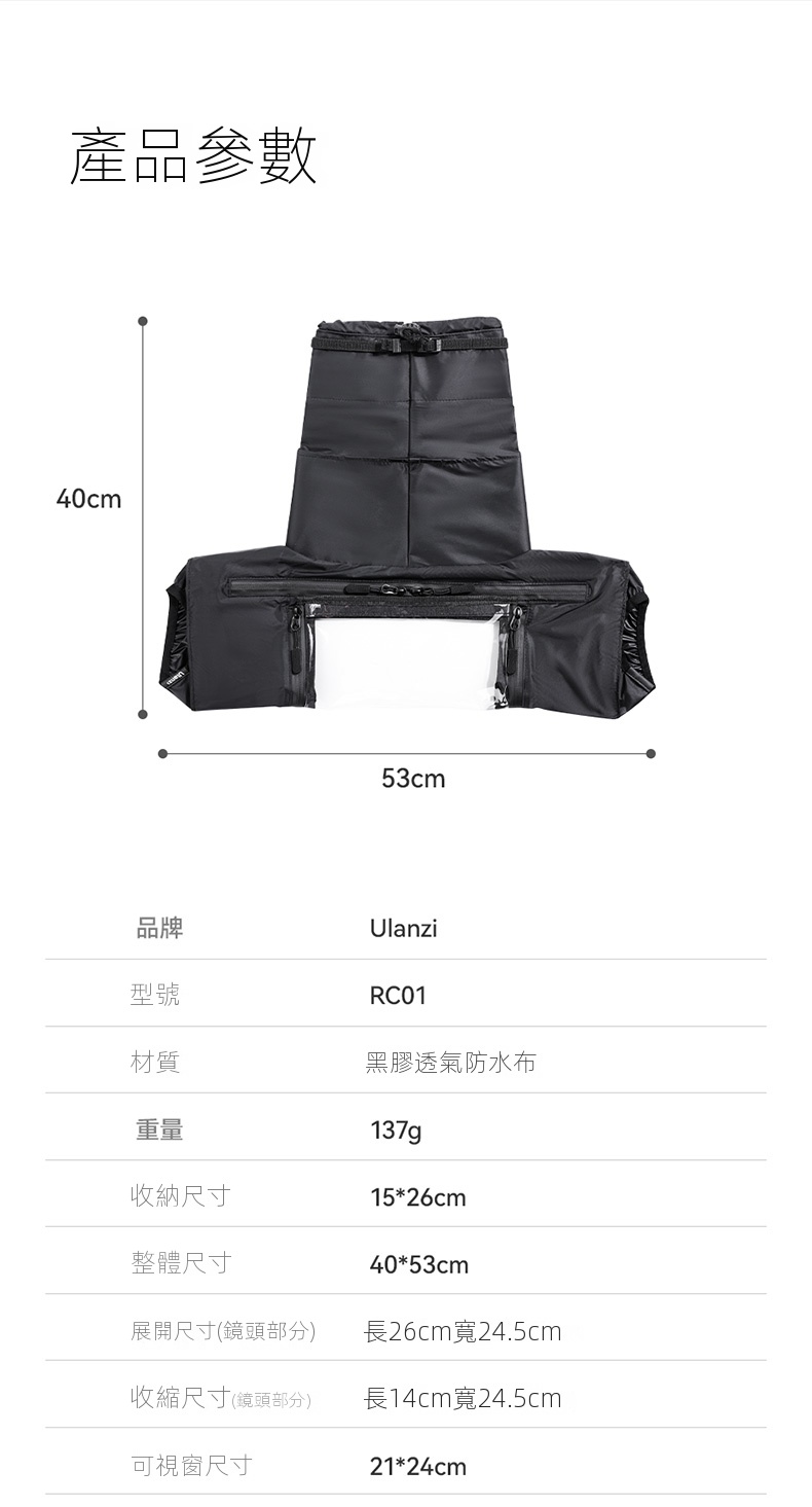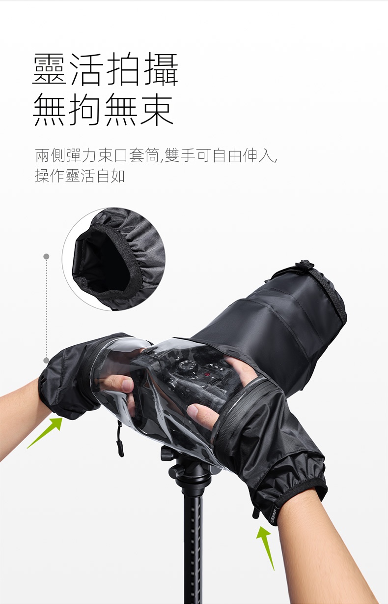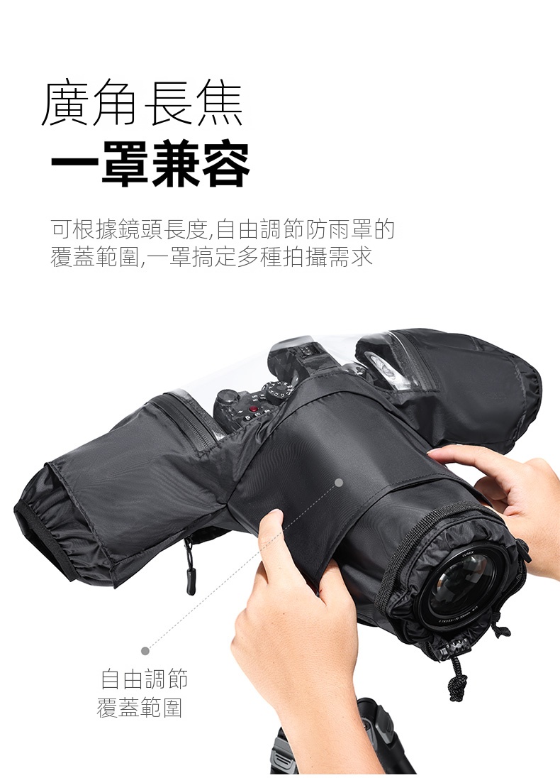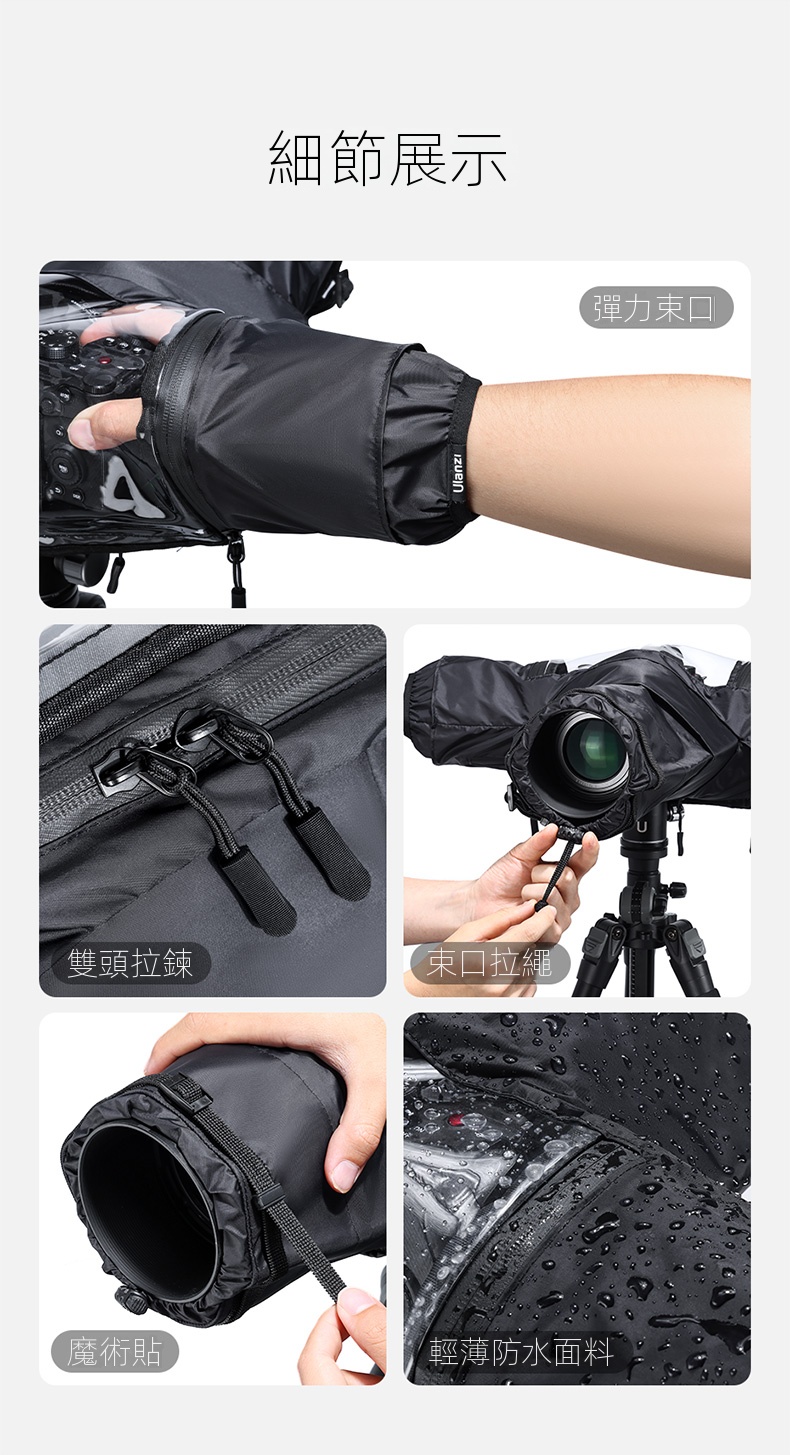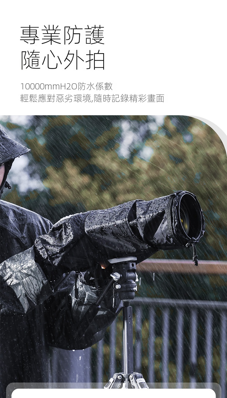 Ulanzi RC01攝影相機防雨罩,為你的攝影保駕護航。它採用高品質防水布料,能有效抵禦雨水侵襲,無論是細雨綿綿或傾盆大雨,都能全方位保護相機,防止因進水造成損壞。透明視窗設計,不影響操作與取景,拍攝參數與相機狀態一目了然。可適應佳能、尼康、索尼等多種品牌的單眼、微單相機及中長焦鏡頭,相容性強。而且,其收納方便,不佔空間,無論是日常拍攝,還是外出旅行、戶外探險,都能隨時攜帶,讓你無懼風雨,捕捉精彩瞬間。