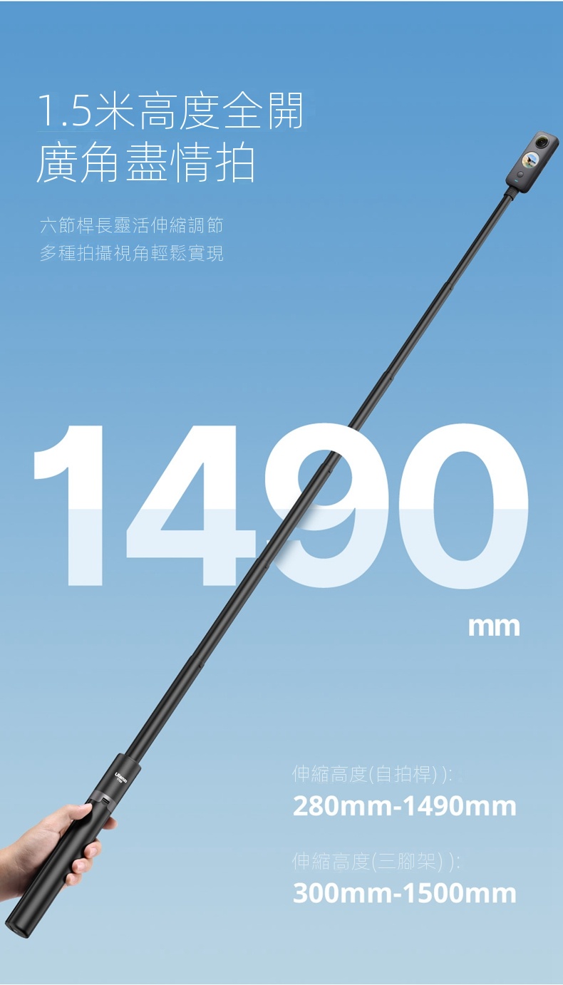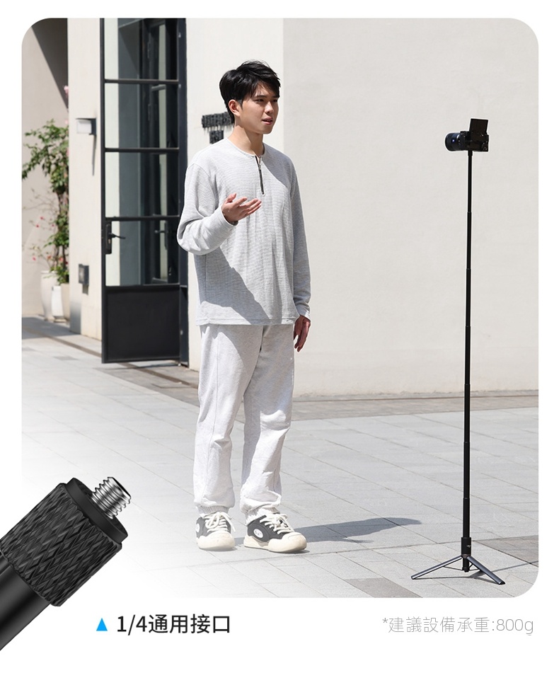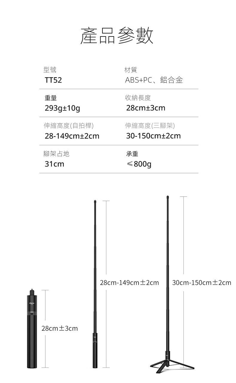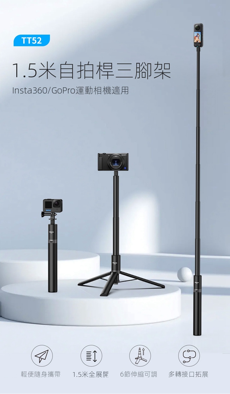 Ulanzi TT52 1.5米延長桿三腳架,攝影攝影好幫手!它的延長桿可拉伸至1.5米,輕鬆突破拍攝高度限制,高低角度隨心所欲切換,為你捕捉獨特視角畫面。三腳架穩固紮實,能在不同地形穩固支撐設備,無懼晃動。材質堅固耐用,輕巧便攜,無論是戶外探險跟拍,還是活動現場記錄,攜帶都毫無負擔。快速展開與收納設計,節省操作時間,讓你不錯過任何精彩瞬間,助你在創作路上一路暢通,盡情釋放創作靈感。