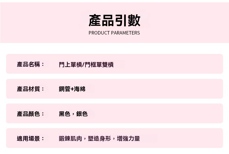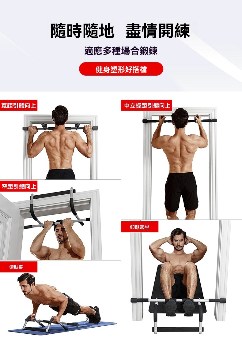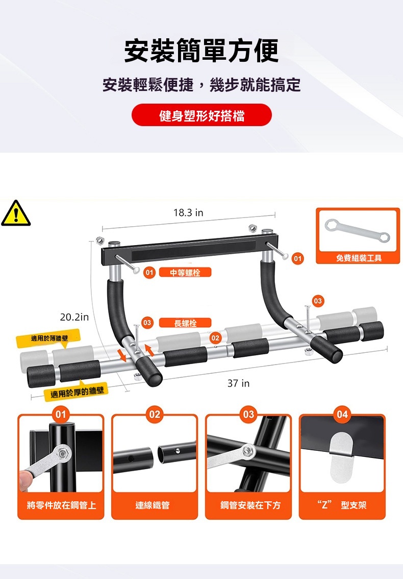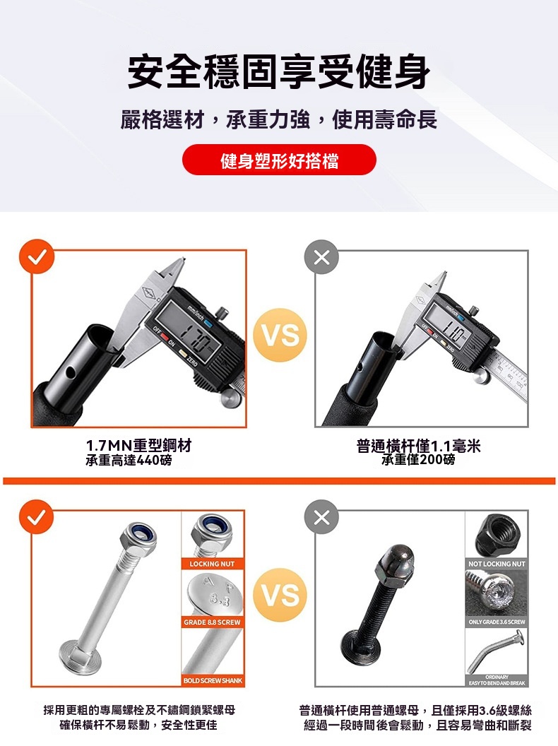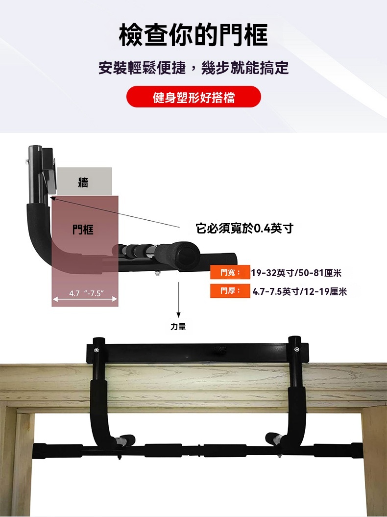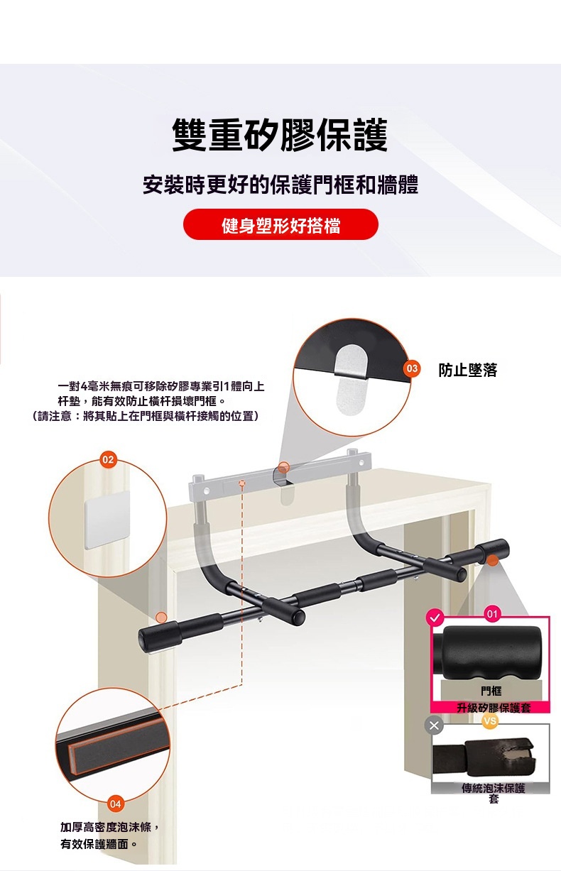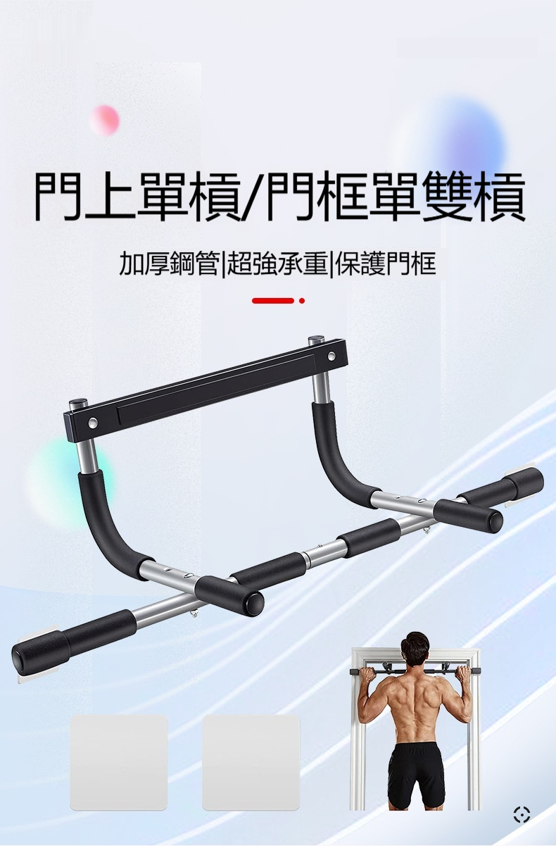 這款免打釘健身門上單槓採用加厚鋼管材質,承重力強,使用壽命長,最高可承重440磅。它配備了更粗的專屬螺栓及不鏽鋼鎖緊螺母,相比普通橫桿,安裝後不易鬆動,安全性更佳。桿身包裹加厚高密度泡沫條,並附帶一對4毫米無痕可移除矽膠墊,能有效防止橫桿損壞門框。產品適用於門寬19-32英寸、門厚4.7-7.5英寸的門框,安裝簡單方便。可用於多種鍛鍊場景,如寬距、中立握距、窄距引體向上、仰臥起坐和俯臥撑,是健身塑形的好搭檔。
