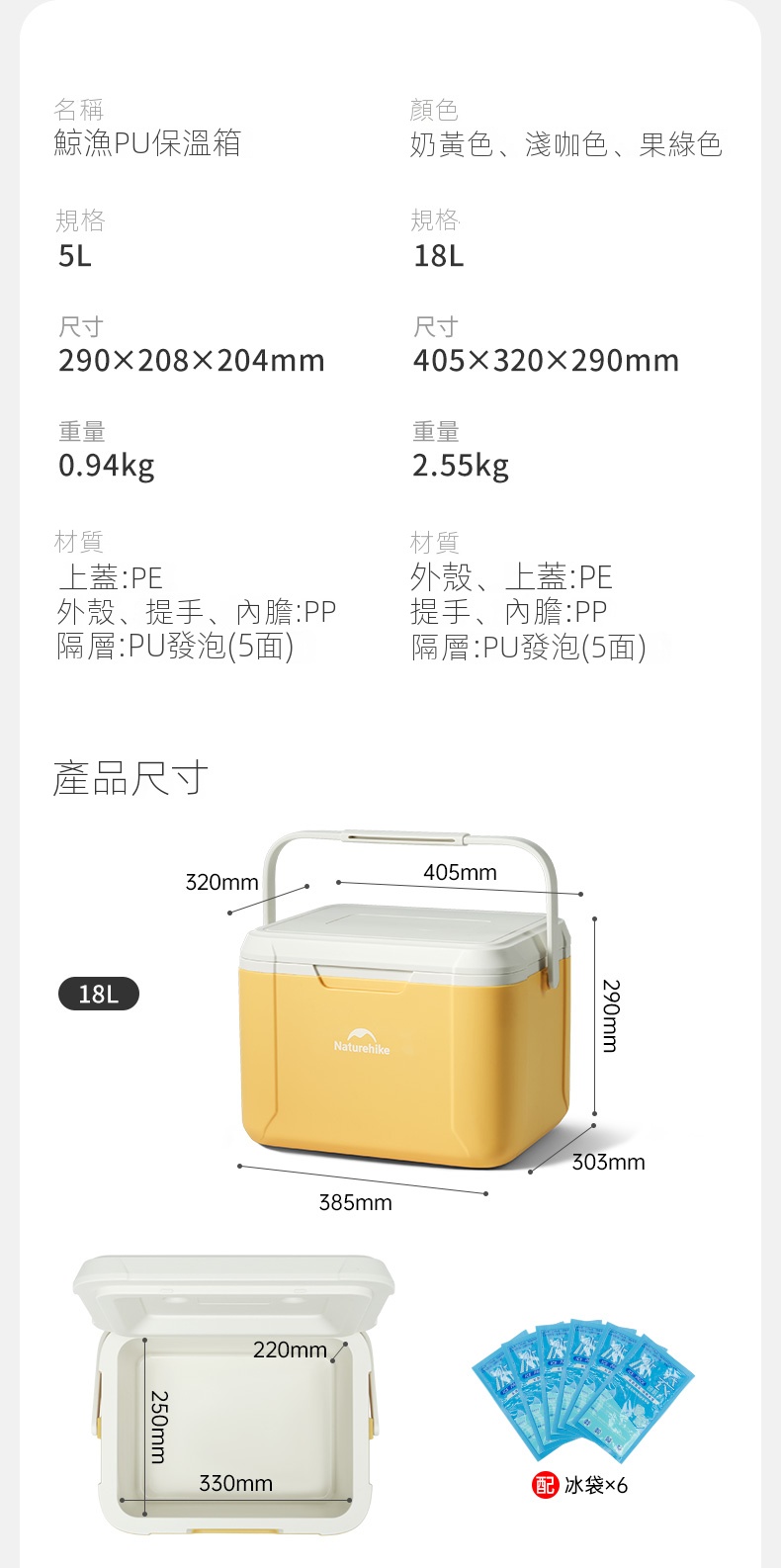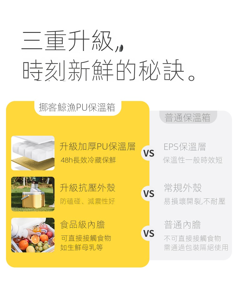 挪客Naturehike鯨漁PU保溫箱,輕巧便攜,適合短途的戶外活動。採用三層鎖溫設計,內膽使用食品級PP材質,加厚PU發泡層有效保冷48小時,保持食物新鮮美味。大開口設計方便取物,堅固耐用,可作為臨時座椅。其安全無異味,適合存放生鮮、母乳等物品。細節處處講究,高密封性箱蓋與加厚提手設計,讓您使用更加安心舒適。