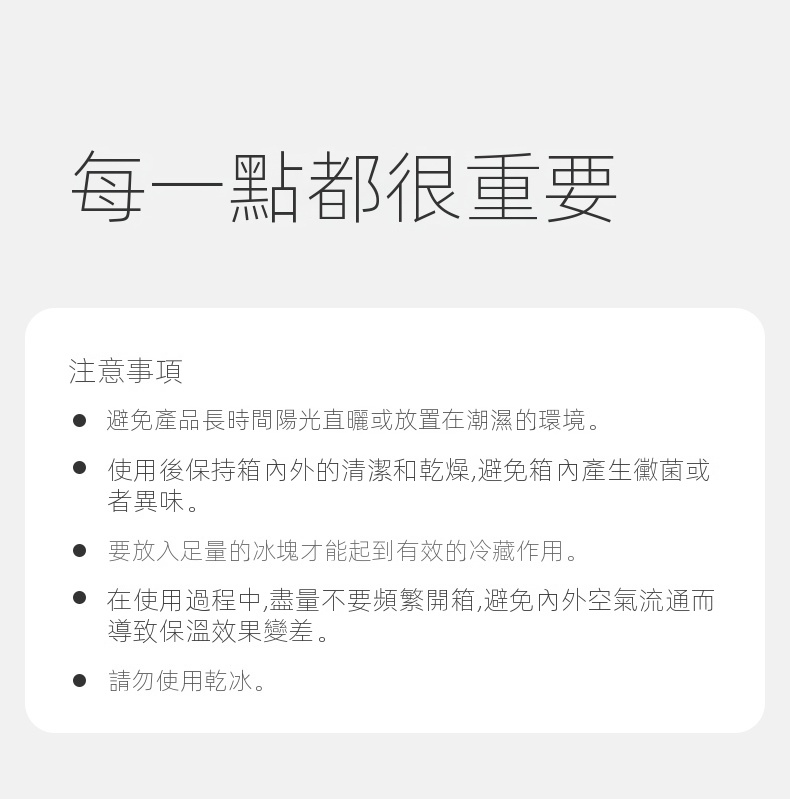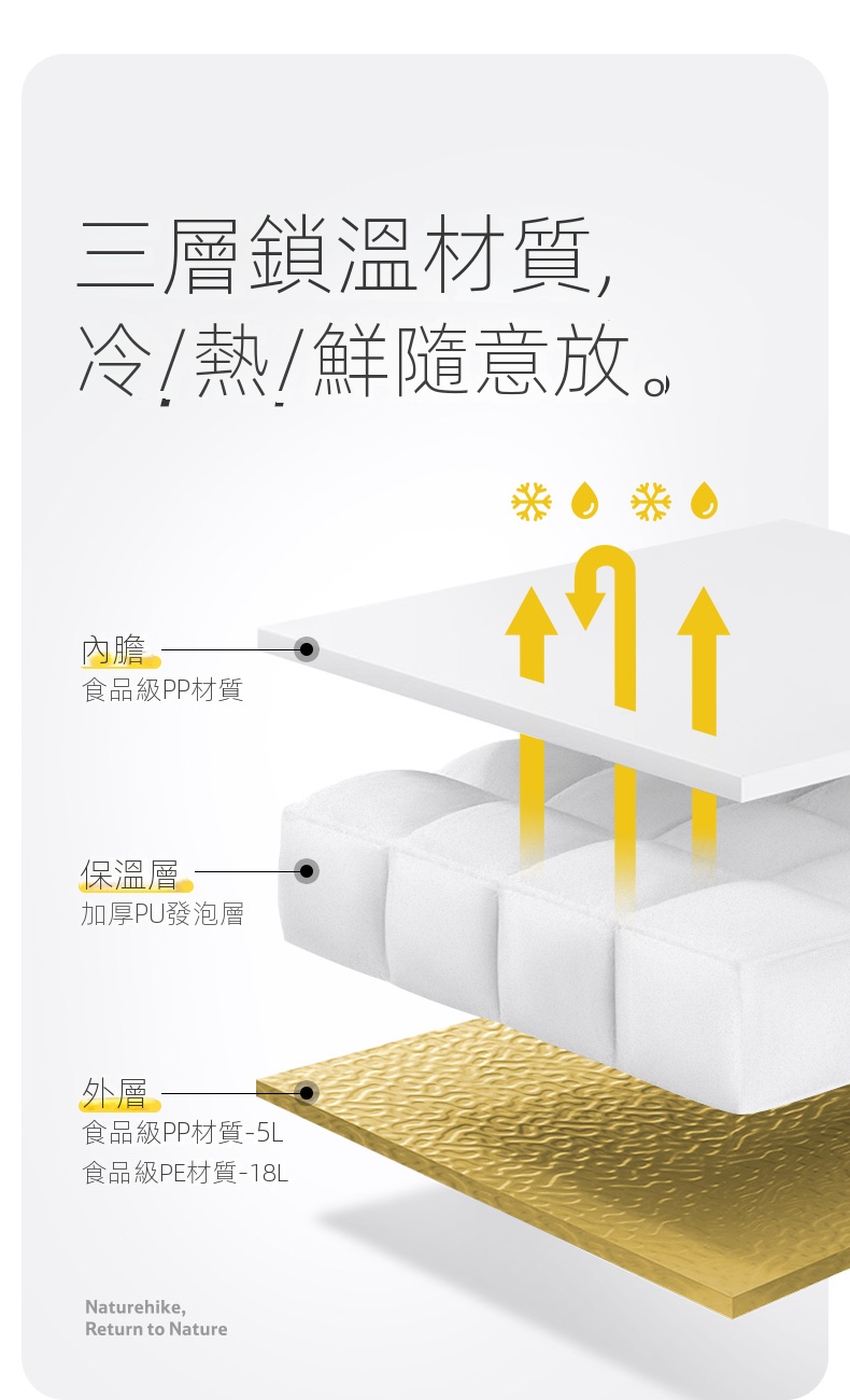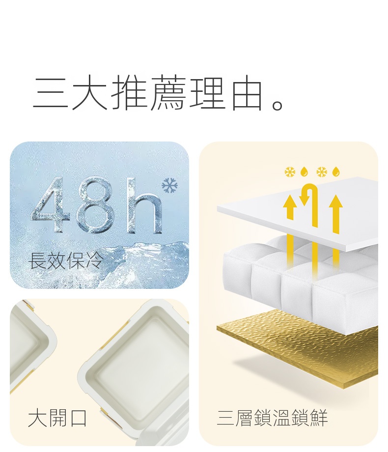 • 三層鎖溫材質,內膽採用食品級PP材質,保溫層為加厚PU發泡層,外層為食品級PP材質
