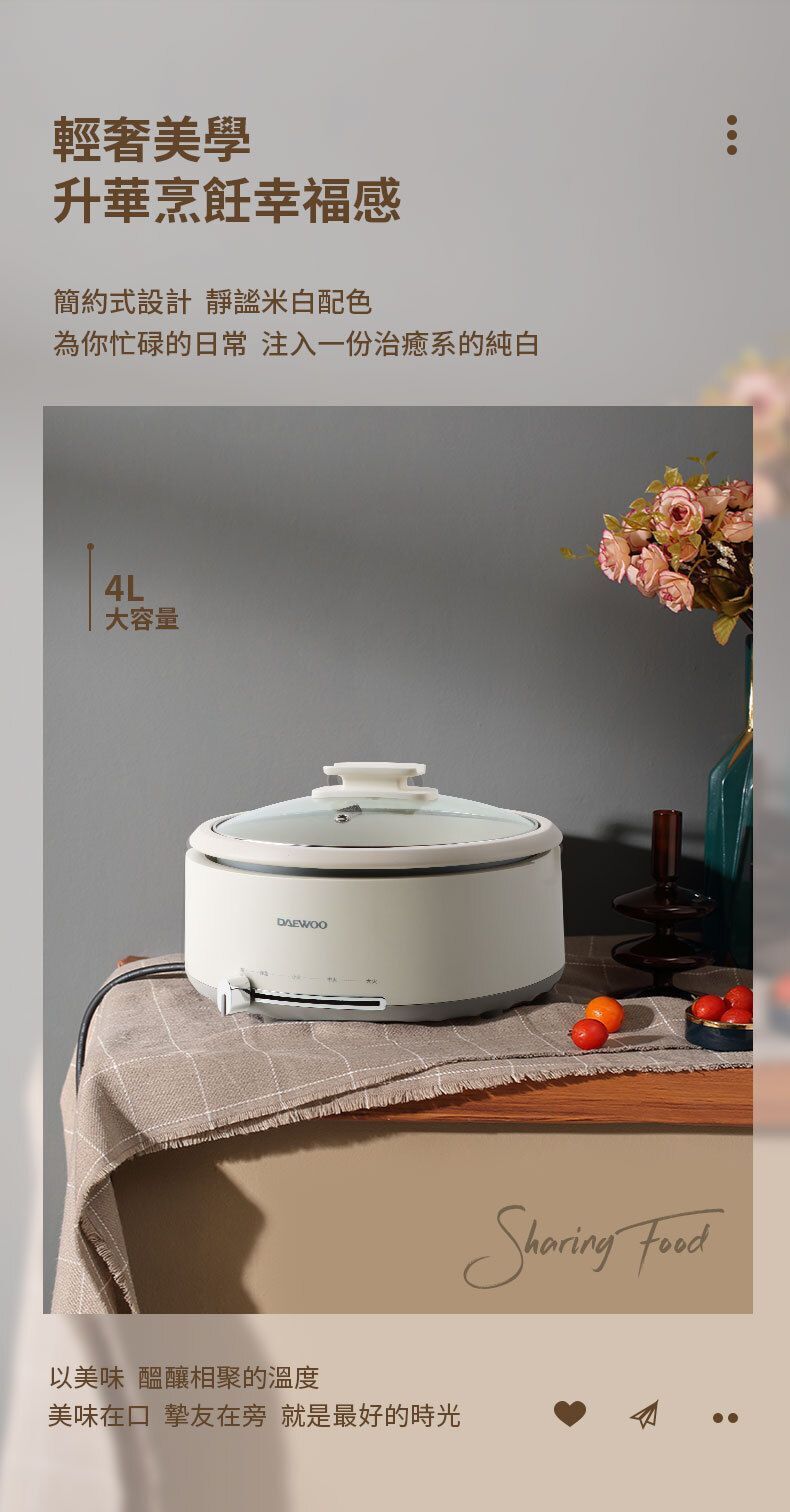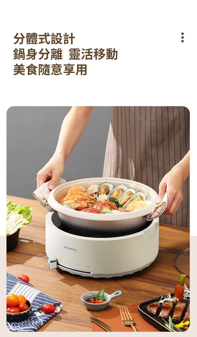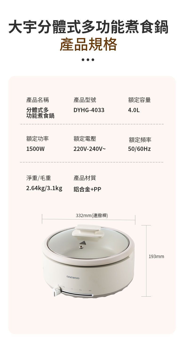 DAEWOO大宇推出分體式多功能煮食鍋(型號DYHG-4033),採用韓式簡約設計與靜謐米白配色,為廚房注入輕奢美學。產品具備4L加深容量,適合4至6人家庭聚會使用。其分體式鍋體設計可輕鬆端拿,並支援可浸泡清洗,不易漏電。鍋具採用包裹式發熱及中凸螺紋底盤,升溫效率快,能鎖住食物鮮嫩。1500W大火力配合滑動控溫,提供低檔慢燉、中檔鎖鮮、高檔加熱及恆定保溫多種模式,無論煎炒燜炖或熬煮鮮湯皆可勝任。可視化玻璃鍋蓋便於觀察烹飪狀態,搭配不黏塗層與加深型設計,清洗方便且湯汁不易外濺。