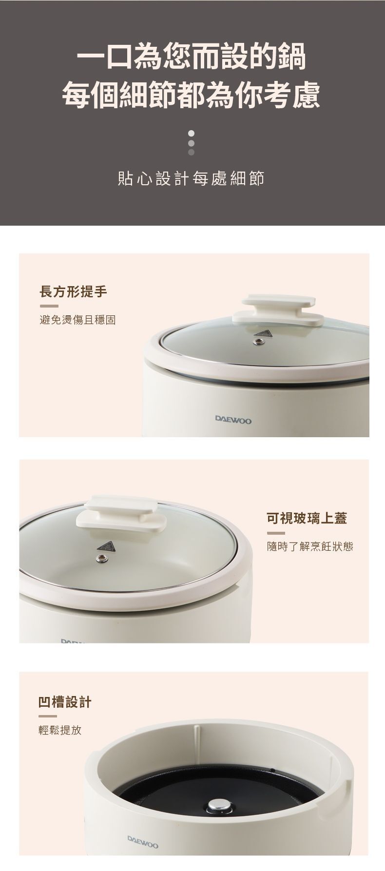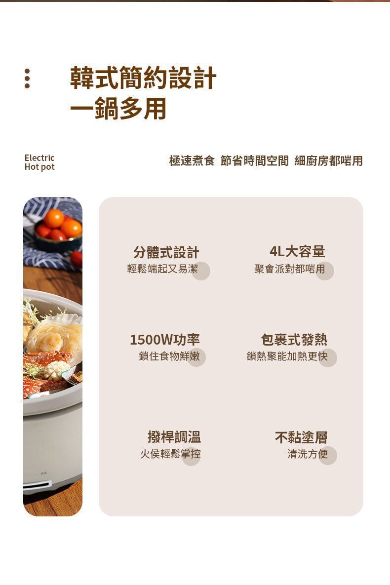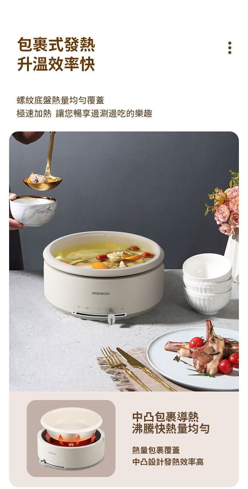 DAEWOO大宇推出分體式多功能煮食鍋(型號DYHG-4033),採用韓式簡約設計與靜謐米白配色,為廚房注入輕奢美學。產品具備4L加深容量,適合4至6人家庭聚會使用。其分體式鍋體設計可輕鬆端拿,並支援可浸泡清洗,不易漏電。鍋具採用包裹式發熱及中凸螺紋底盤,升溫效率快,能鎖住食物鮮嫩。1500W大火力配合滑動控溫,提供低檔慢燉、中檔鎖鮮、高檔加熱及恆定保溫多種模式,無論煎炒燜炖或熬煮鮮湯皆可勝任。可視化玻璃鍋蓋便於觀察烹飪狀態,搭配不黏塗層與加深型設計,清洗方便且湯汁不易外濺。