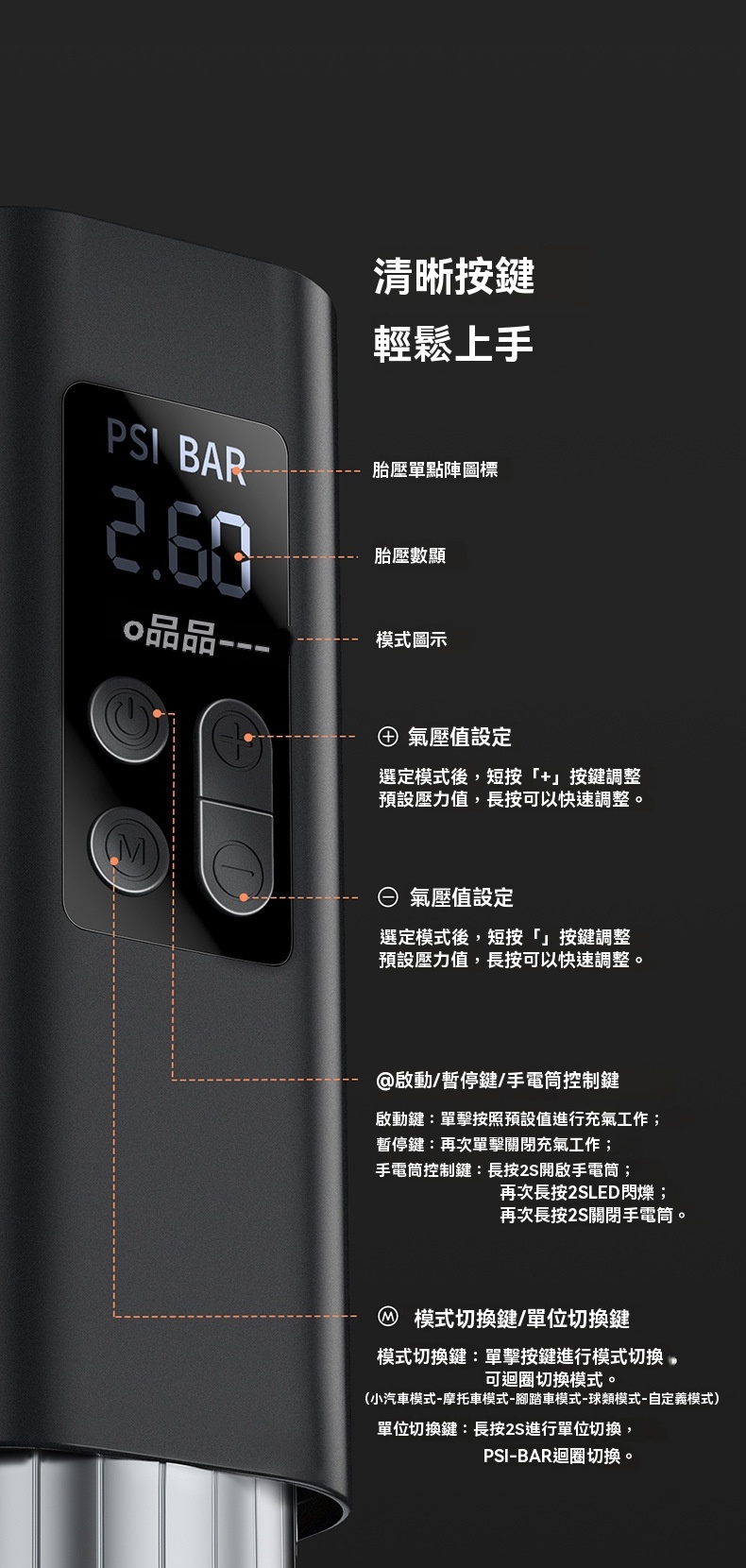 • 智慧數顯控制:LED 螢幕即時顯示氣壓,支援單位切換,一鍵預設後自動充停,避免過充風險。