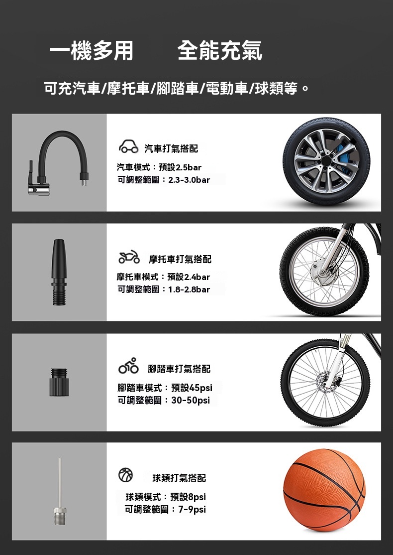 • 多場景適配:配備多種氣嘴,不僅適用於汽車輪胎,還能為摩托車、自行車及球類等充氣。
