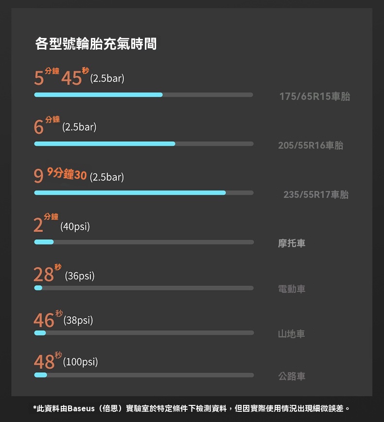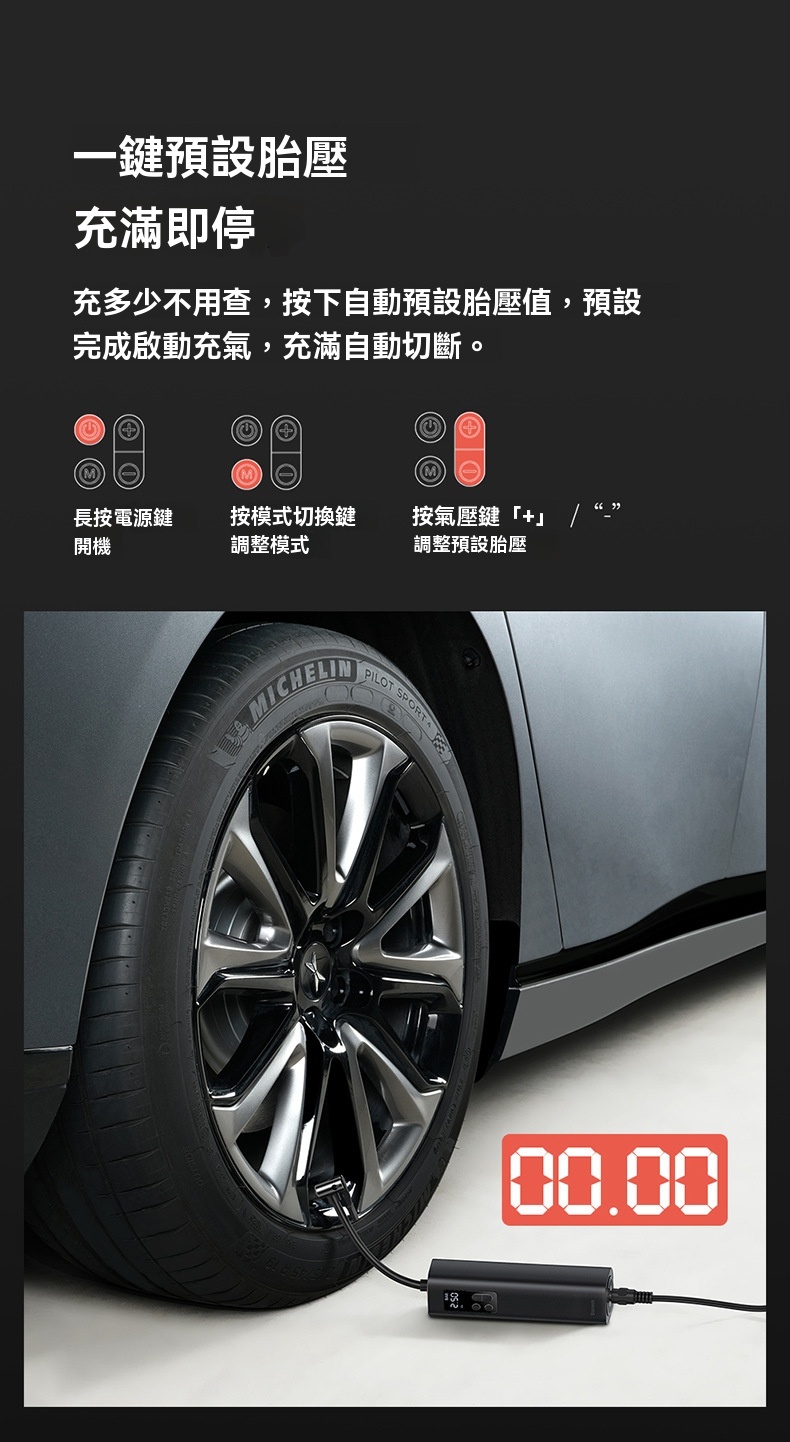 • 高速充氣效率:18000 轉 / 分鐘高速電機,每分鐘可充氣 30 公升,快速補足胎壓。