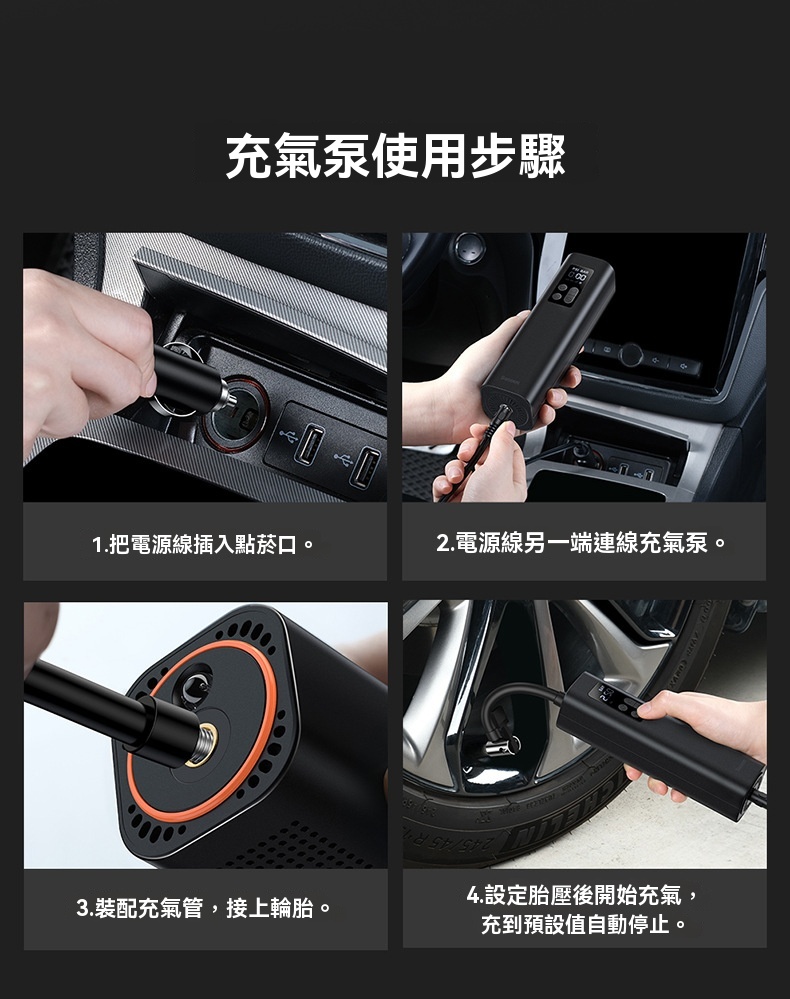 • 便利供電設計:12V 汽車點煙器取電,搭配 3 公尺長電源線,輕鬆觸達車輛各輪胎。