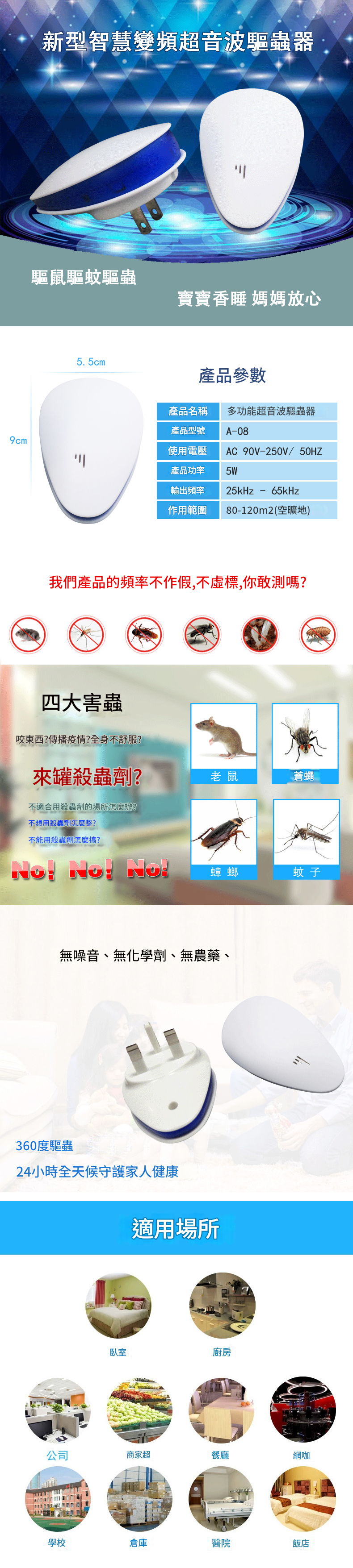 多功能超聲波驅鼠驅蟲器採用自動變頻技術,物理驅趕老鼠、蚊子、蟑螂等害蟲,安全無害。360度全方位驅蟲,24小時全天候守護家人健康。無噪音、無化學劑,適合臥室、廚房、公司等多種場所使用。讓您和家人遠離害蟲困擾,享受舒適生活環境。
