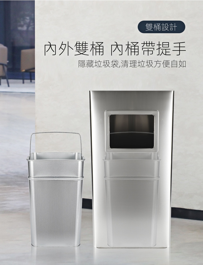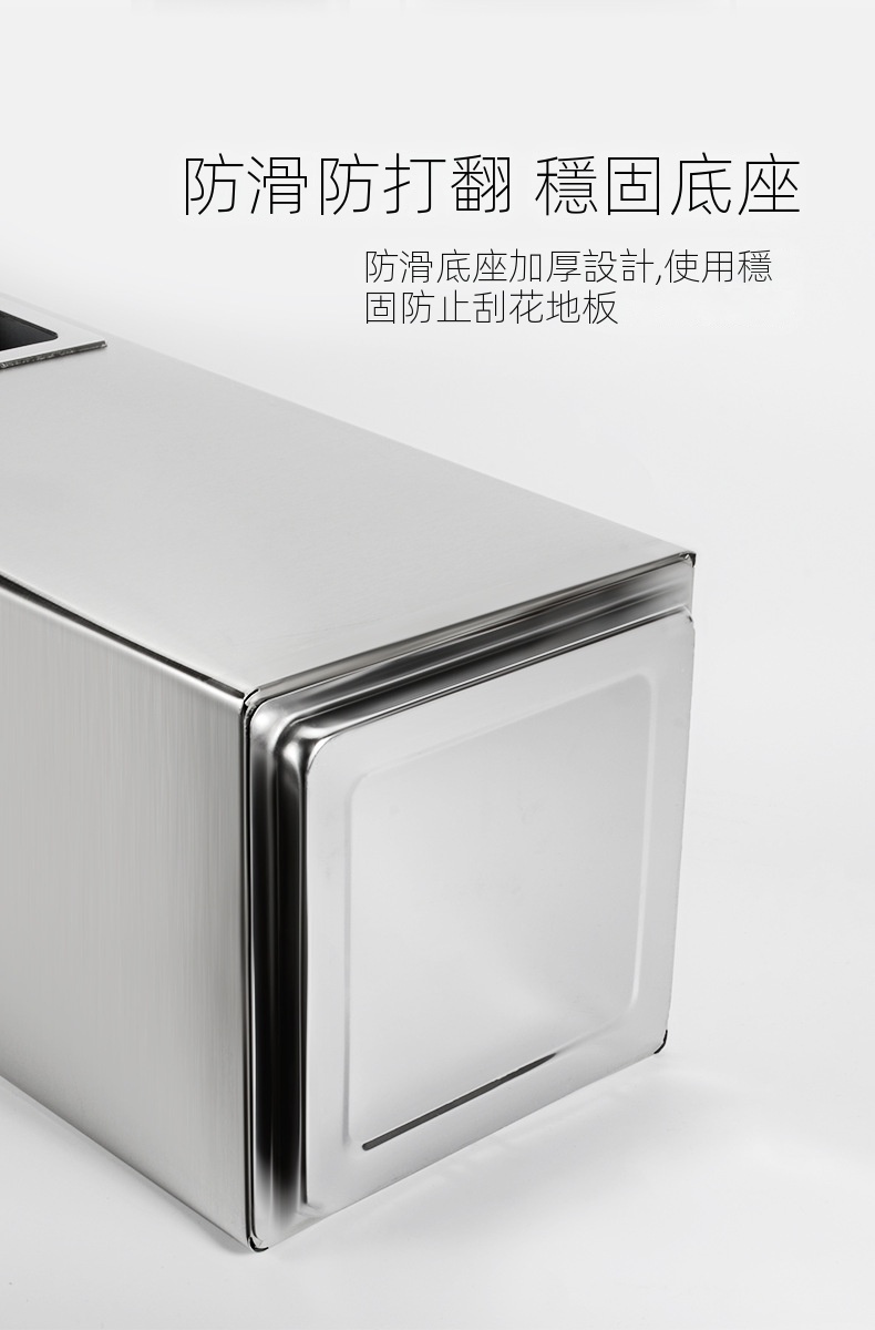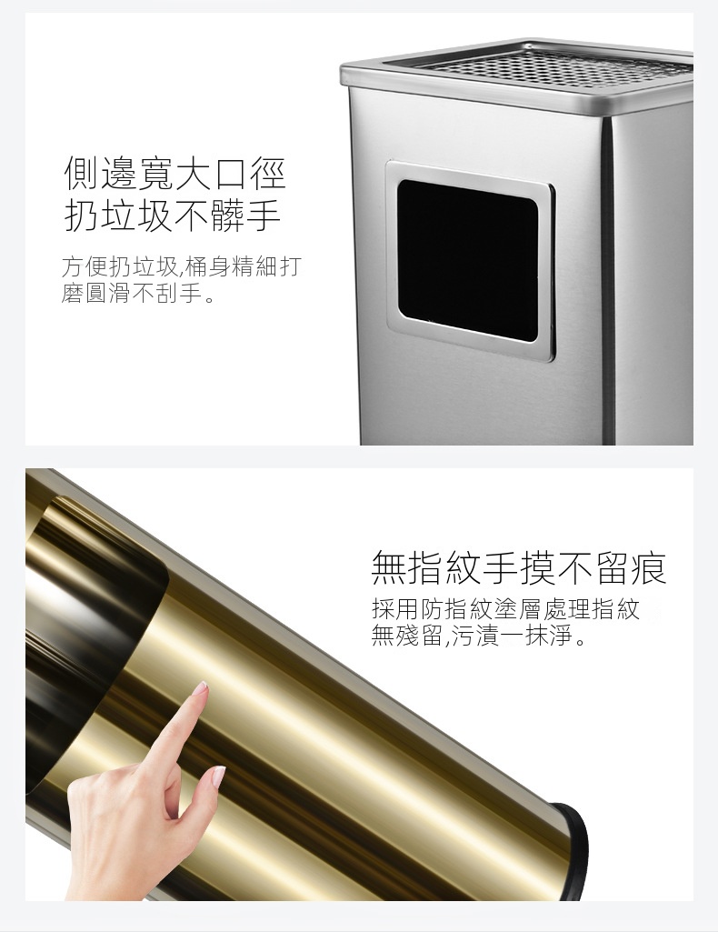 這款垃圾桶採用防污塗層,清洗方便且不易留下污漬,適合酒店、走廊、百貨商場和辦公室等多種場景。其寬口設計讓丟垃圾時不易弄髒手,桶身經過精細打磨,安全無刮手。無指紋塗層保持外觀潔淨,加厚防滑底座防止打翻,堅固材質確保耐用。
