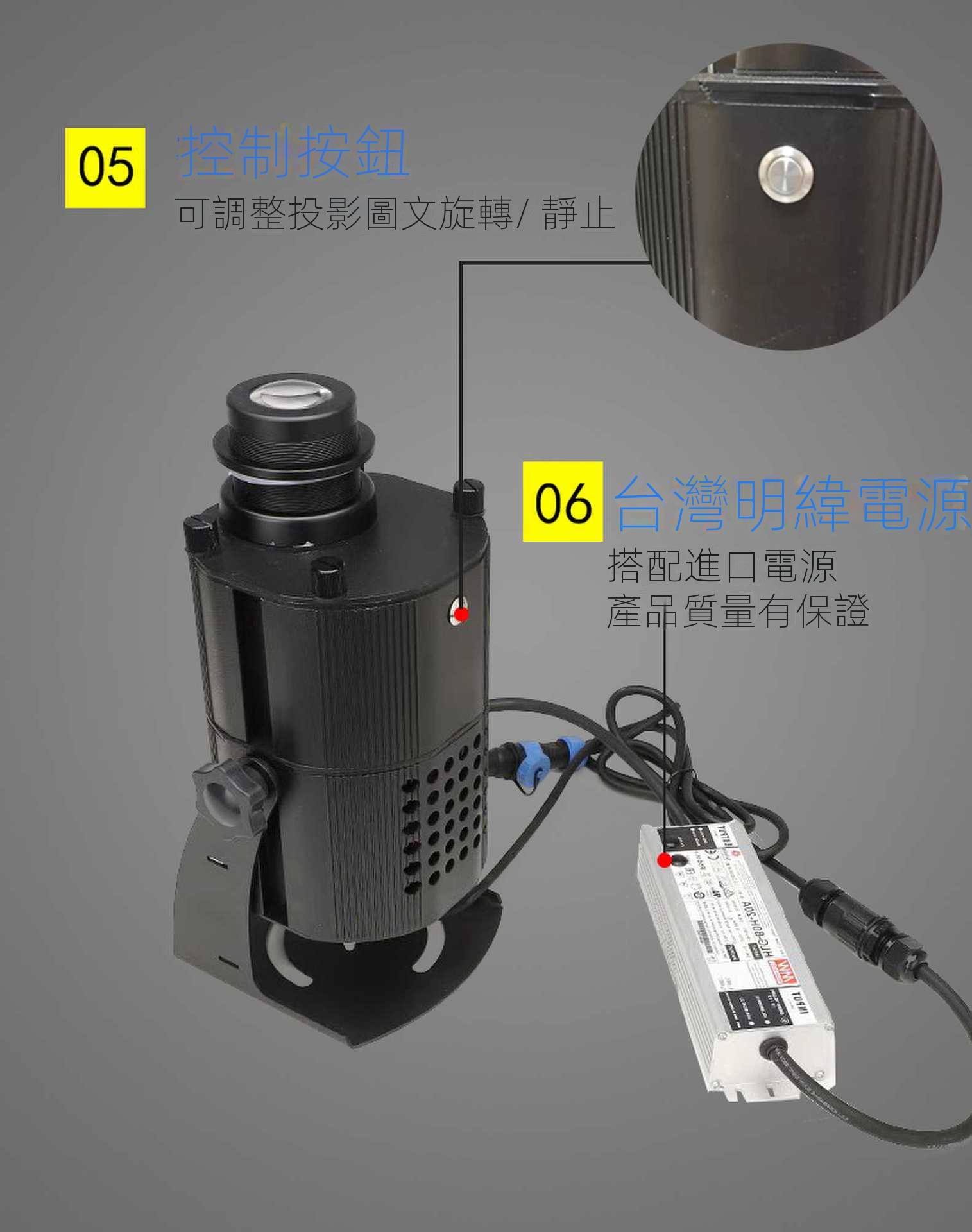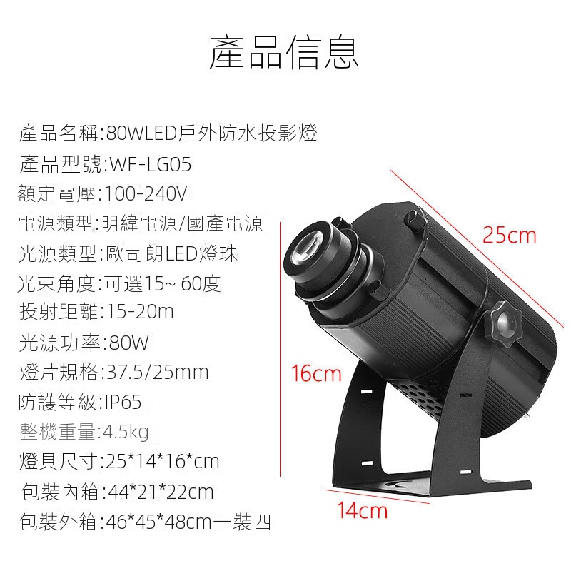 80W LED戶外防水投影燈(WF-LG05),採用歐司朗LED燈珠,光束角度15~60度可選,投射距離達15-20公尺。內建明緯電源,支援100-240V電壓,防護等級IP65,具備專用散熱孔洞設計,延長燈具使用壽命。燈具尺寸為25x14x16cm,重量僅4.5公斤,輕便易安裝。控制按鈕可調整投影圖文旋轉或靜止,適合各種戶外應用場景。