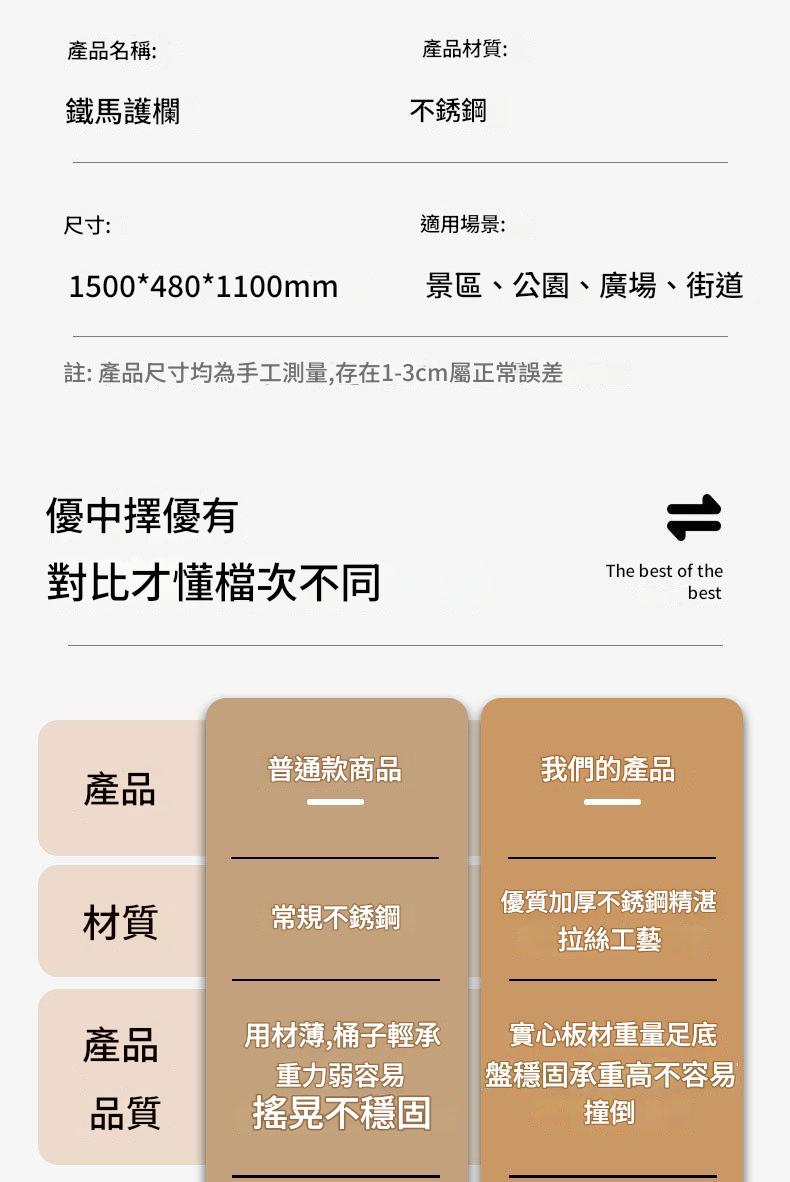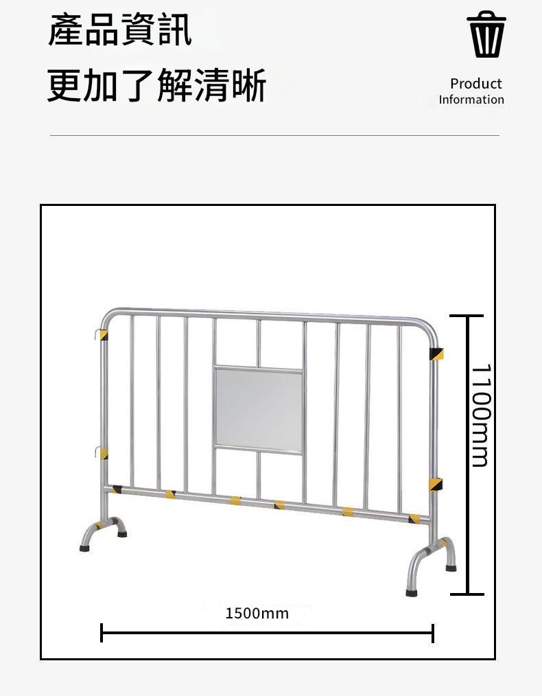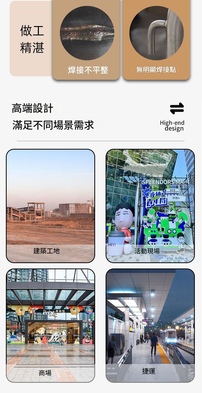 這款不銹鋼可移動鐵馬圍欄長2米,採用優質加厚不銹鋼材質,經過精湛拉絲工藝處理,表面無明顯焊接點,外觀高檔大氣。實心板材底盤穩固,承重力強,不會輕易搖晃,適合景區、公園、廣場、街道等多種場景使用。產品尺寸為手工測量,可能存在1-3cm誤差,屬正常現象。此款鐵馬圍欄由專業團隊研發設計,不僅滿足日常需求,更適用於建築工地、商場、地鐵站等活動現場,提供安全可靠的隔離與引導功能。