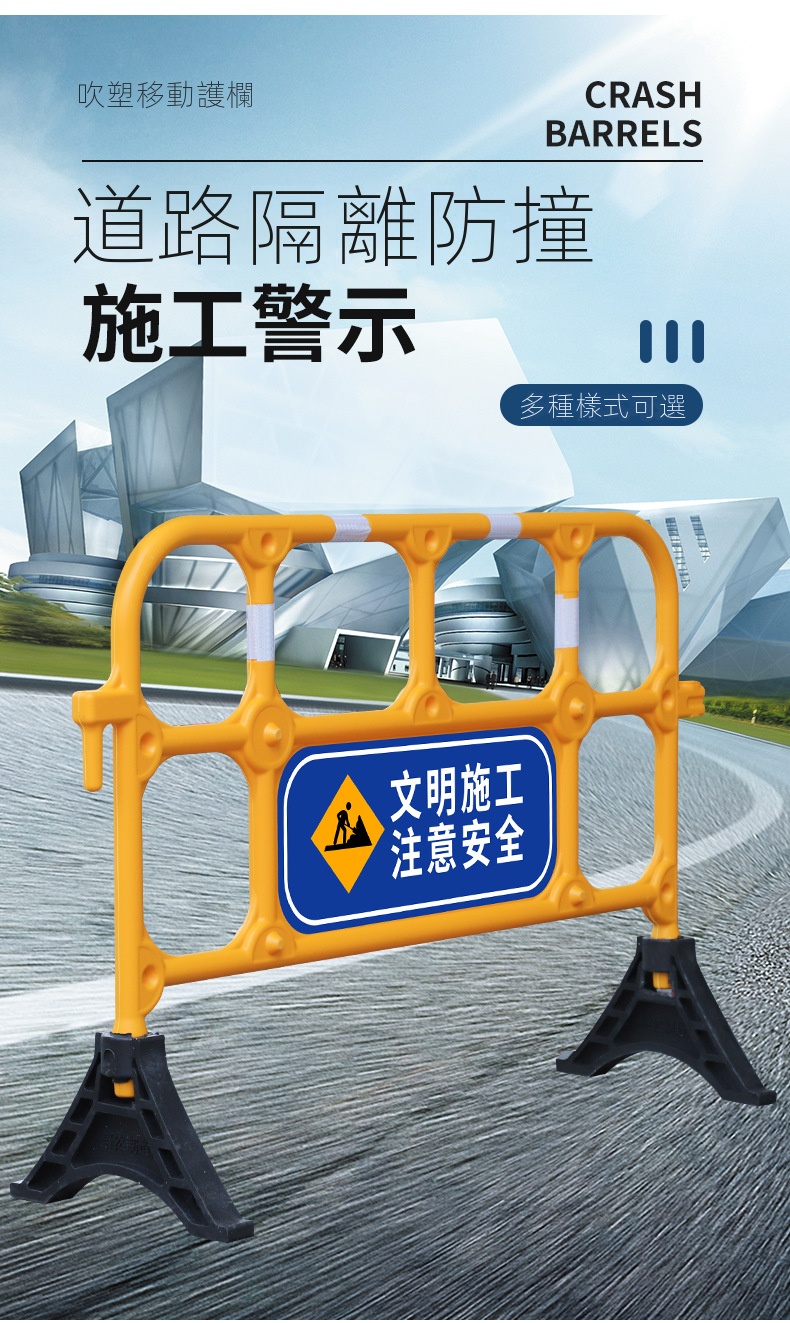 黃色吹塑移動護欄採用三角穩固底座與卡扣設計,確保抗強風且不易脫落。此塑膠可移動鐵馬圍欄搬運輕便、安裝快速,相比玻璃鋼、彩鋼板及鐵護欄更為環保無污染,有效節省人工與搬運成本。產品使用靈活,可隨道路彎道調整彎度,多個護欄能隨意拼接組合,適用於各種場景的道路隔離與防撞需求。實拍圖展示其真實樣貌,讓您購得放心。