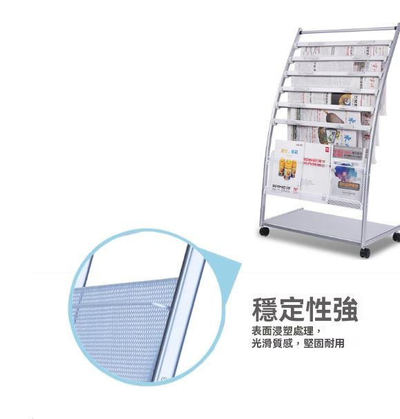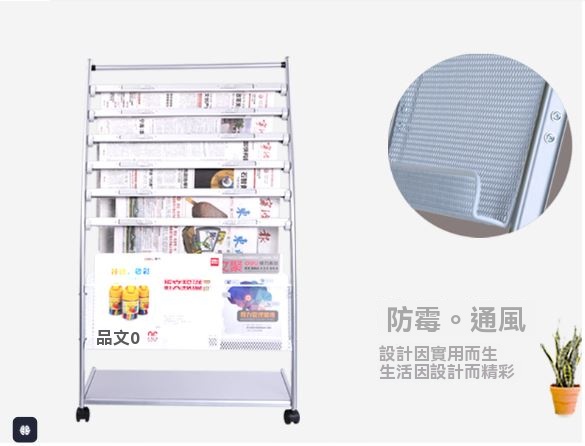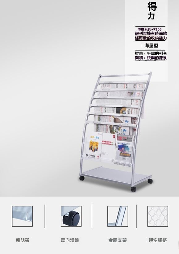DELI 得力 9303 可移動報紙架 ,採用金屬支架與鏤空網格設計,搭配斜面結構,讓報紙雜誌取放更加方便整齊。三層收納空間可放置10-20本雜誌,底座亦可供過期報紙存放,實現有效分類管理。萬向活輪設計,輕鬆移動無負擔,適用於圖書館、會議室、居家大廳等場所。