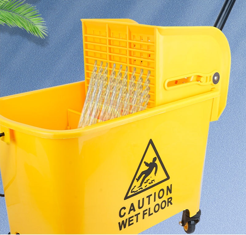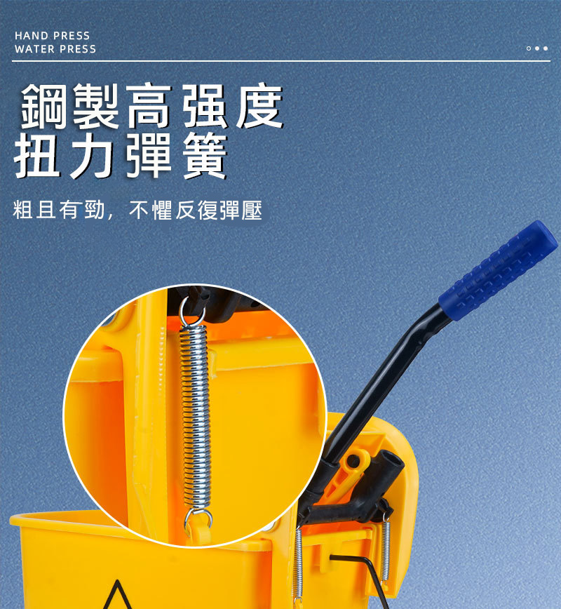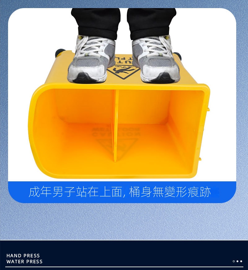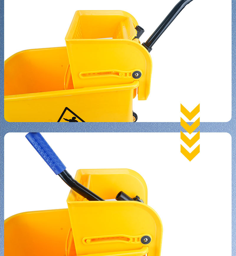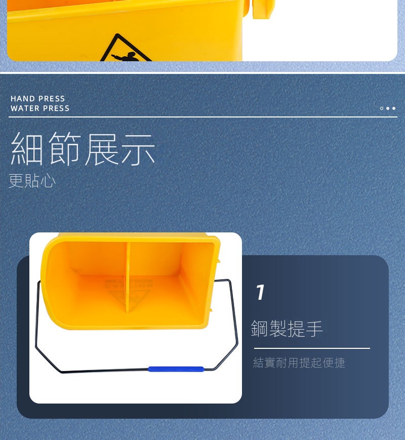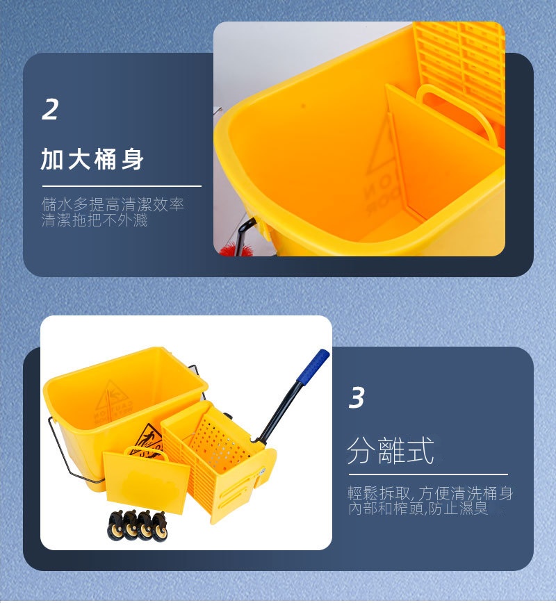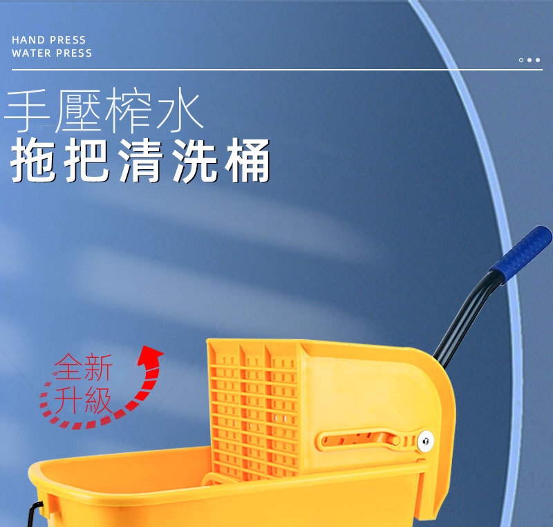 受壓式拖把脫水桶,商用家用皆適用,可減少清潔時間和勞力。採用靈活360°萬向輪與手壓式榨水頭,拖布免手擰,省力又衛生。桶身可作為收納空間,保持清潔工具整齊不亂。天然橡膠腳輪靜音耐磨,移動自如。它適配多種拖把。