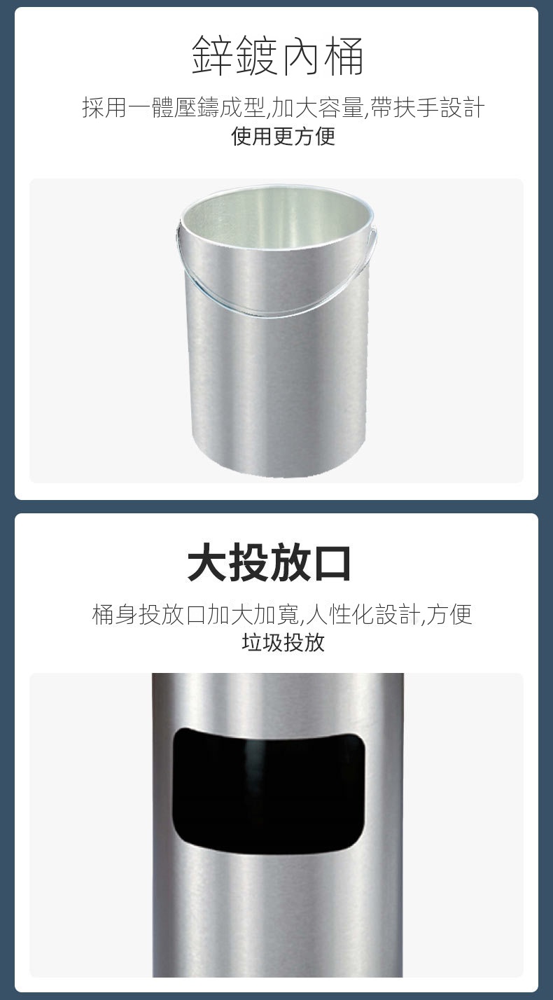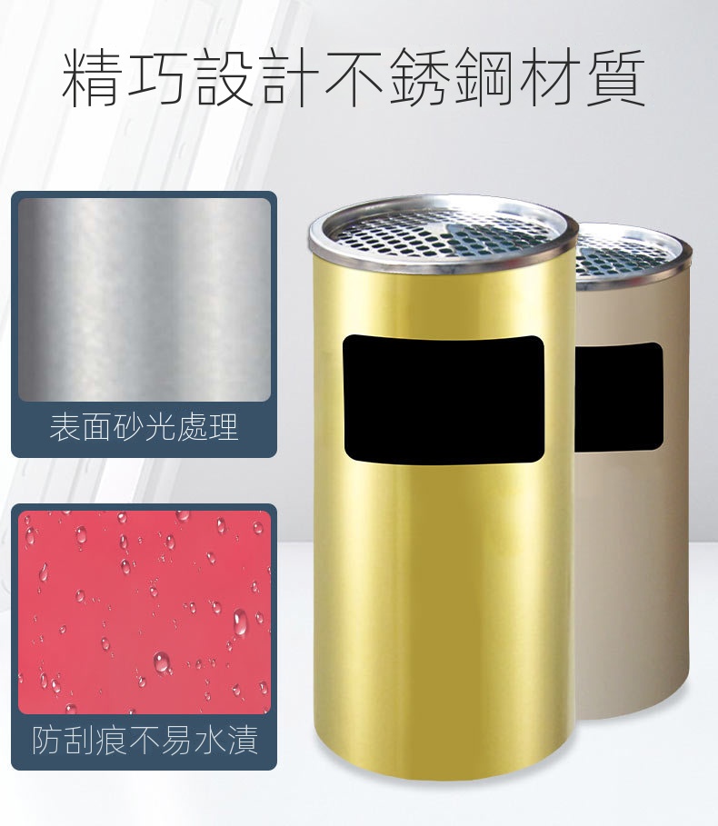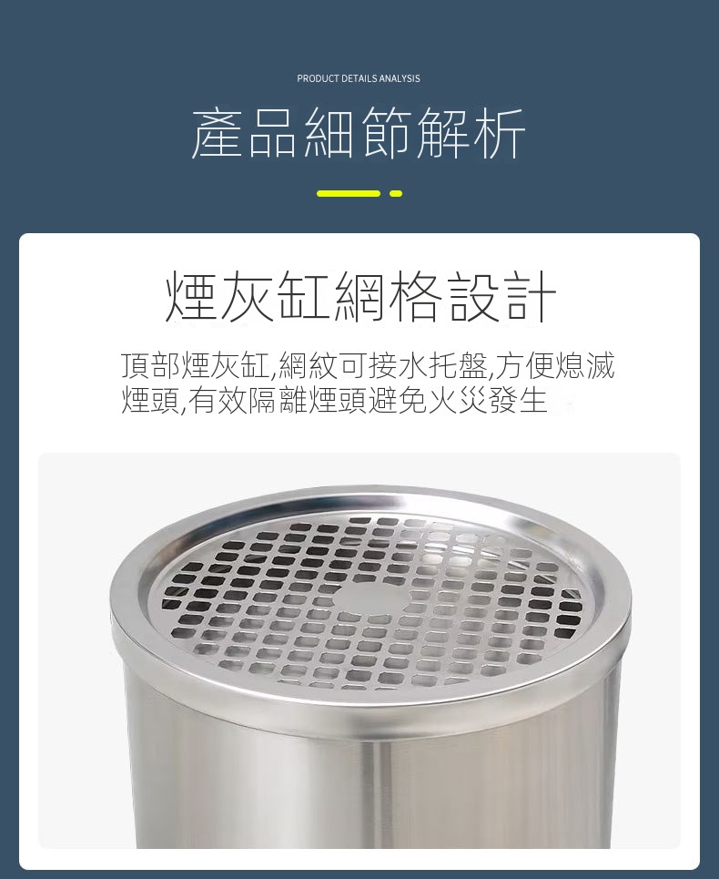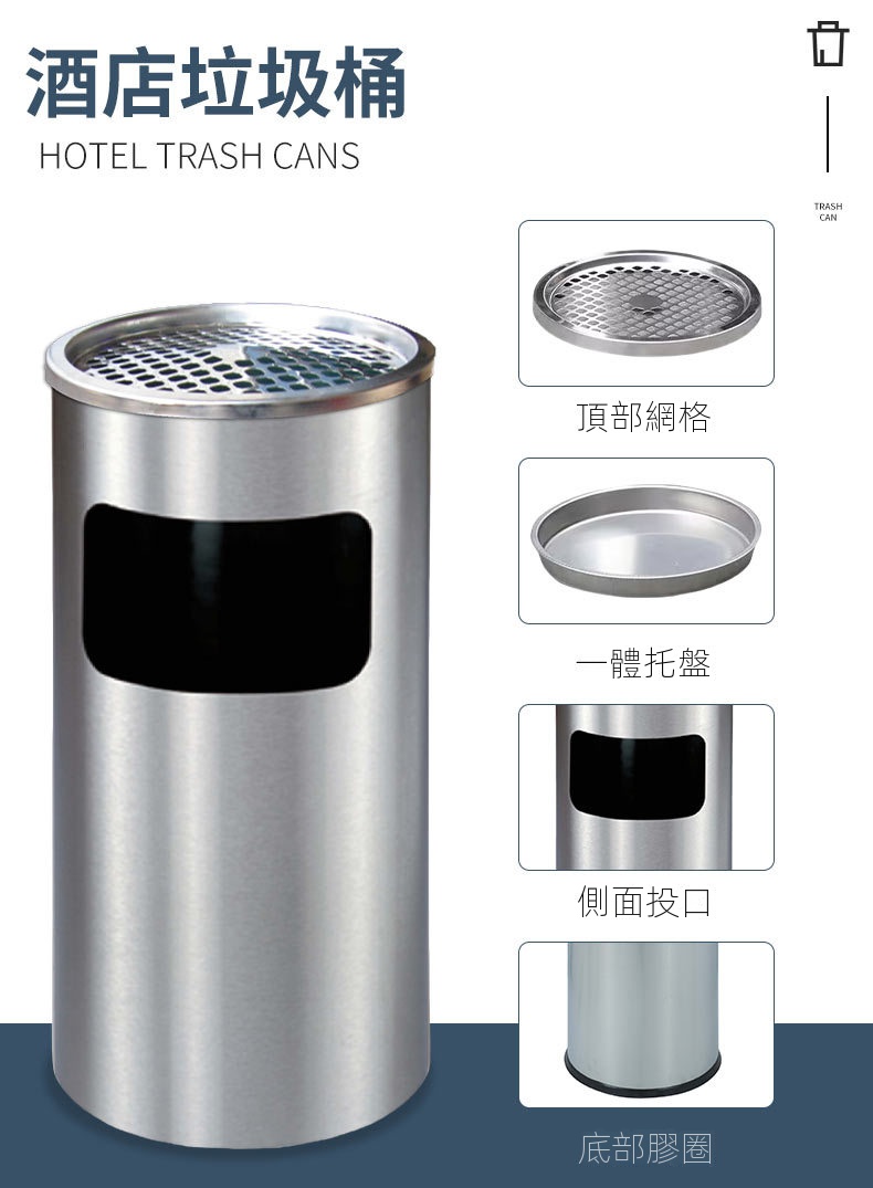 這款產品以一體化設計為特色,頂部網格托盤與側面投口相結合,外觀精緻。它採用耐用的不銹鋼材質,經砂光處理,表面防刮且耐水漬,確保長期使用。內桶採用0.5MM鍍鋅材料,附扶手設計,方便取用,容量加大,滿足多種需求。安全設計方面,頂部煙灰缸網紋配有水托盤,有效熄滅煙頭,降低火災風險。人性化的加大加寬投放口,令使用更加便捷,適用於商場、書店、會所和餐廳等多種場合。