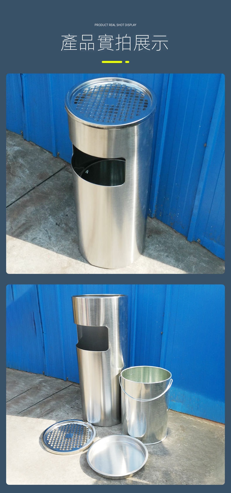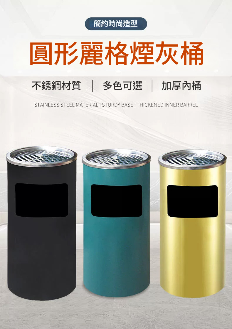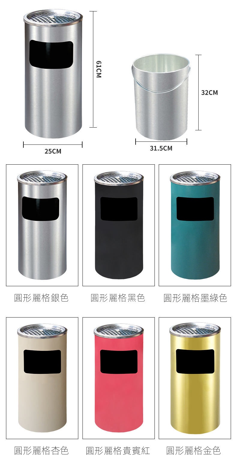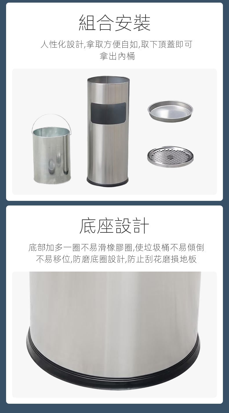 這款產品以一體化設計為特色,頂部網格托盤與側面投口相結合,外觀精緻。它採用耐用的不銹鋼材質,經砂光處理,表面防刮且耐水漬,確保長期使用。內桶採用0.5MM鍍鋅材料,附扶手設計,方便取用,容量加大,滿足多種需求。安全設計方面,頂部煙灰缸網紋配有水托盤,有效熄滅煙頭,降低火災風險。人性化的加大加寬投放口,令使用更加便捷,適用於商場、書店、會所和餐廳等多種場合。