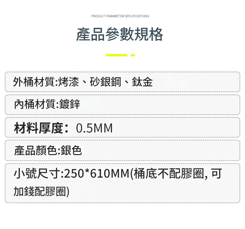 • 外桶材質:烤漆、砂銀鋼、鈦金