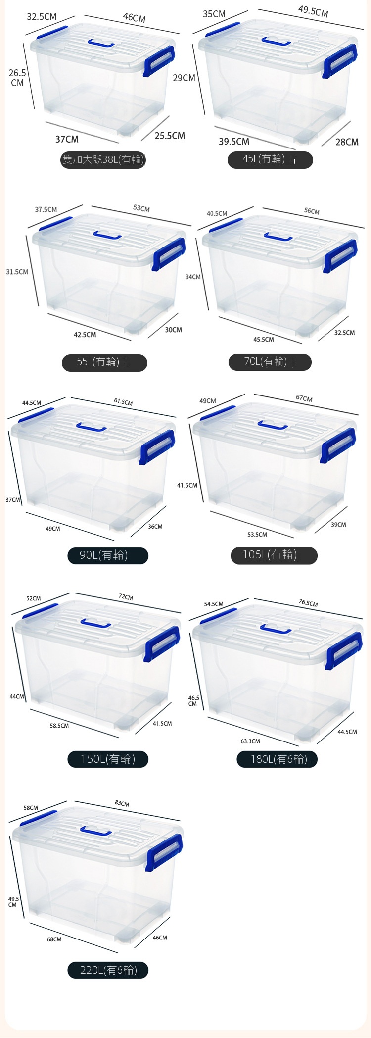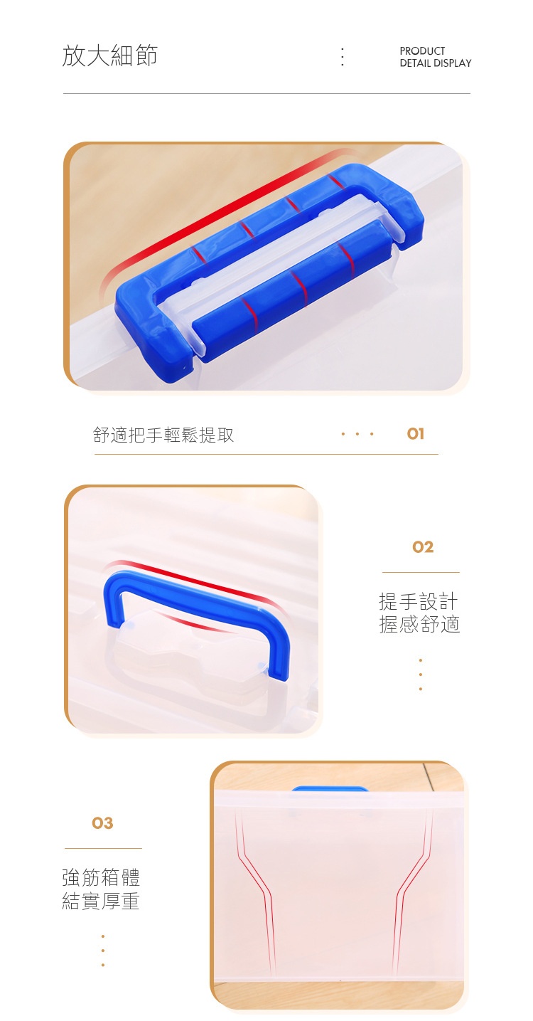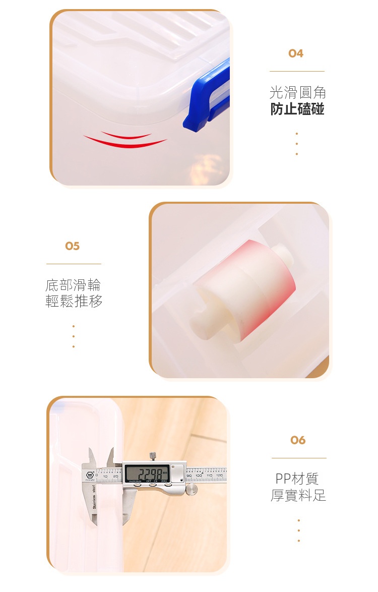 透明塑膠家用收納箱採用嚴選PP材質,無異味且通過甲醛檢測,提供從6.5L至220L容量選擇。無論是衣櫃、客廳還是浴室,皆能輕鬆對應。加厚設計與穩固結構,搭配舒適提手及滑輪,讓取物更便捷。透明箱體一目了然,大小箱子可疊加碼放,合理利用每寸空間。