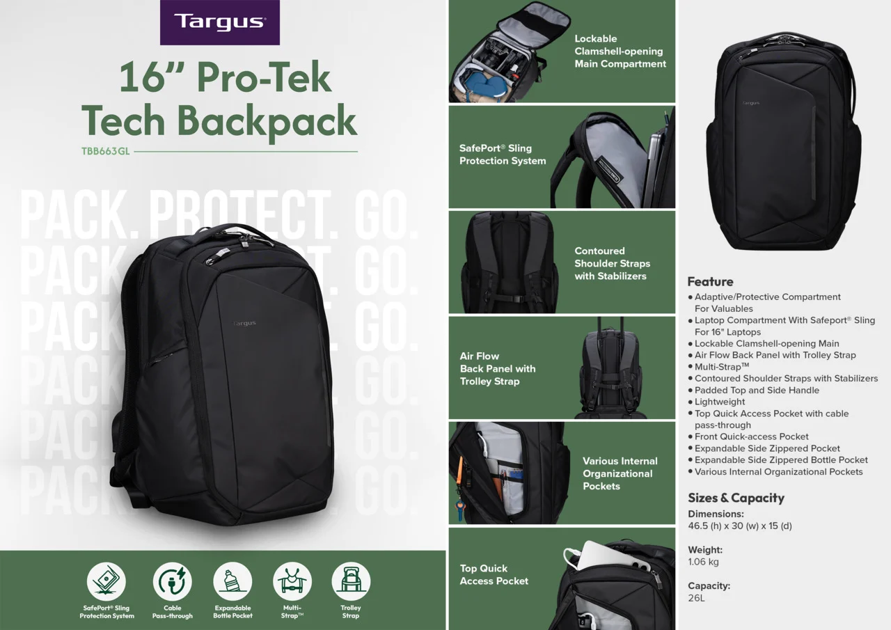 TARGUS TBB663 Pro-Tek® 16 吋科技背包,以 “Pack. Protect. Go.” 為核心設計理念,專為日常通勤、創意工作及即興出行打造。它採用經典黑色外觀,容量達 26L,尺寸 46.5×30×15cm,僅重 1.06kg,輕不壓身。背包具備多重實用功能:含帶 Safeport® 懸吊系統的 16 吋筆記本隔層,可穩固保護設備;主隔層採用可上鎖蚌殼式開合設計,另有適配貴重物品的防護隔層;頂部與正面設有快速存取口袋,頂部口袋還帶線纜通道,方便充電。側邊有可擴展拉鍊口袋與水壺袋,內部多個收納口袋能規整小物。同時,它配備透氣背板、帶穩定器的人體工學肩帶及帶緩衝的頂部與側邊提手,還含行李帶可固定在拉桿箱上,搭配終身有限保修,兼具安全性、便利性與耐用性。