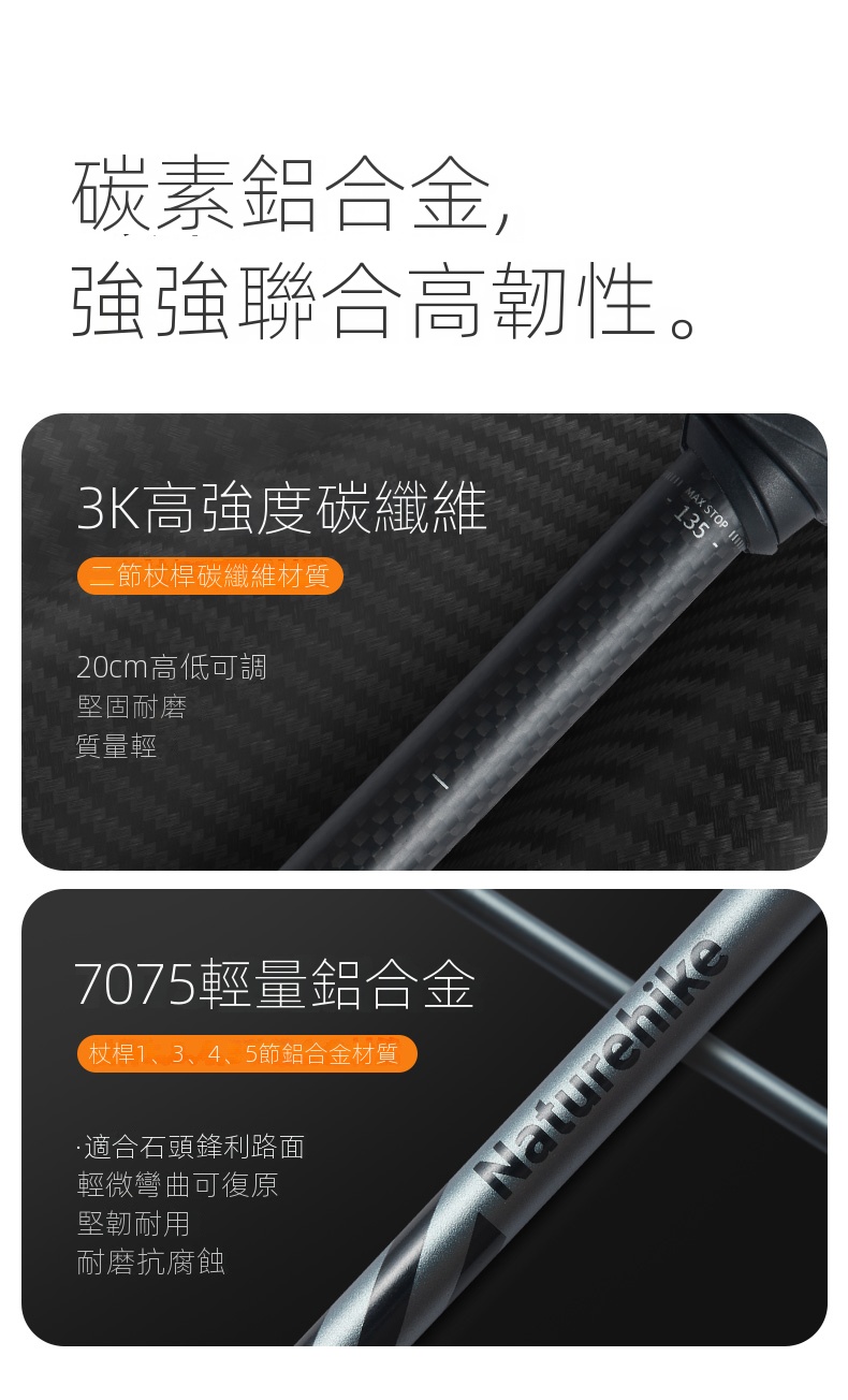 Naturehike挪客長風UL碳鋁五節折疊登山杖,採用3K碳纖維與7075鋁合金,輕盈堅固。五節折疊設計,隨心收納,方便攜帶。EVA加長手柄搭配可調節腕帶,提供舒適穩固的握感,適合各類地形,是專業徒步及家庭出行的理想選擇。成對使用更能分擔身體壓力,保護膝蓋,讓您輕鬆征服崎嶇山地。
