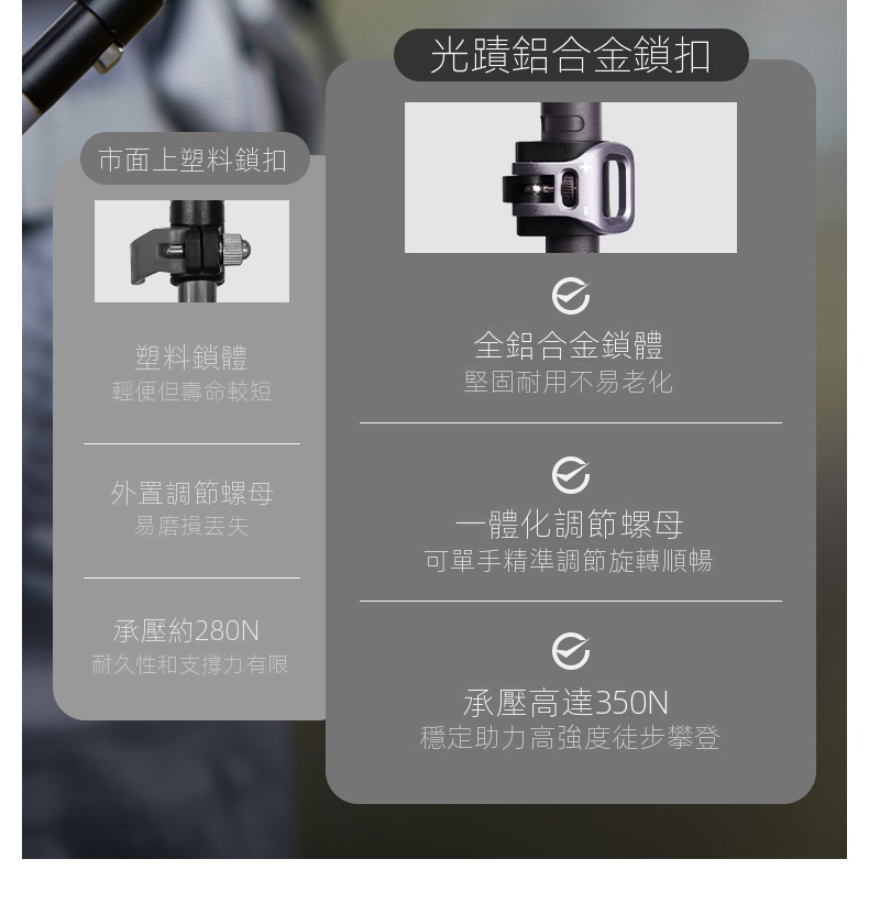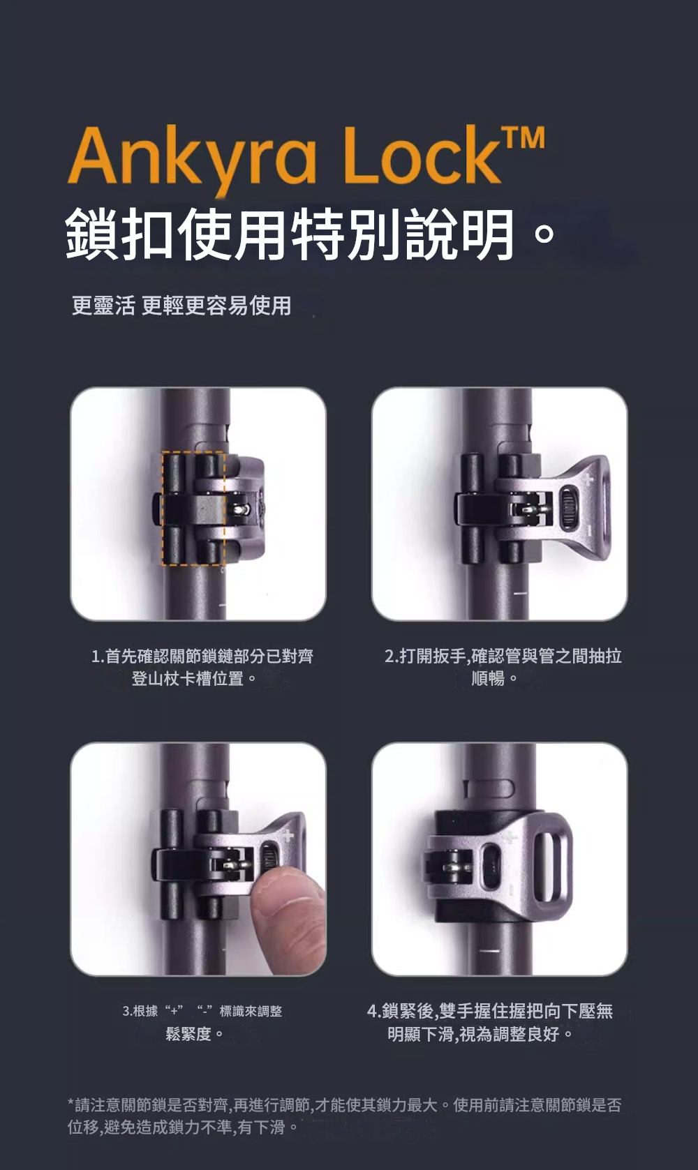 • Ankyra Lock™鋁合金鎖扣系統,快速調節、強力鎖定