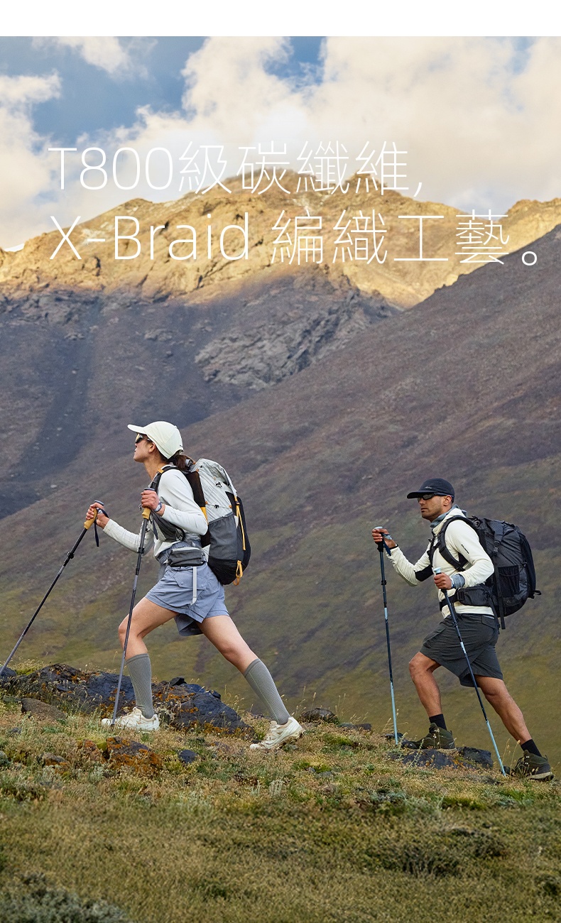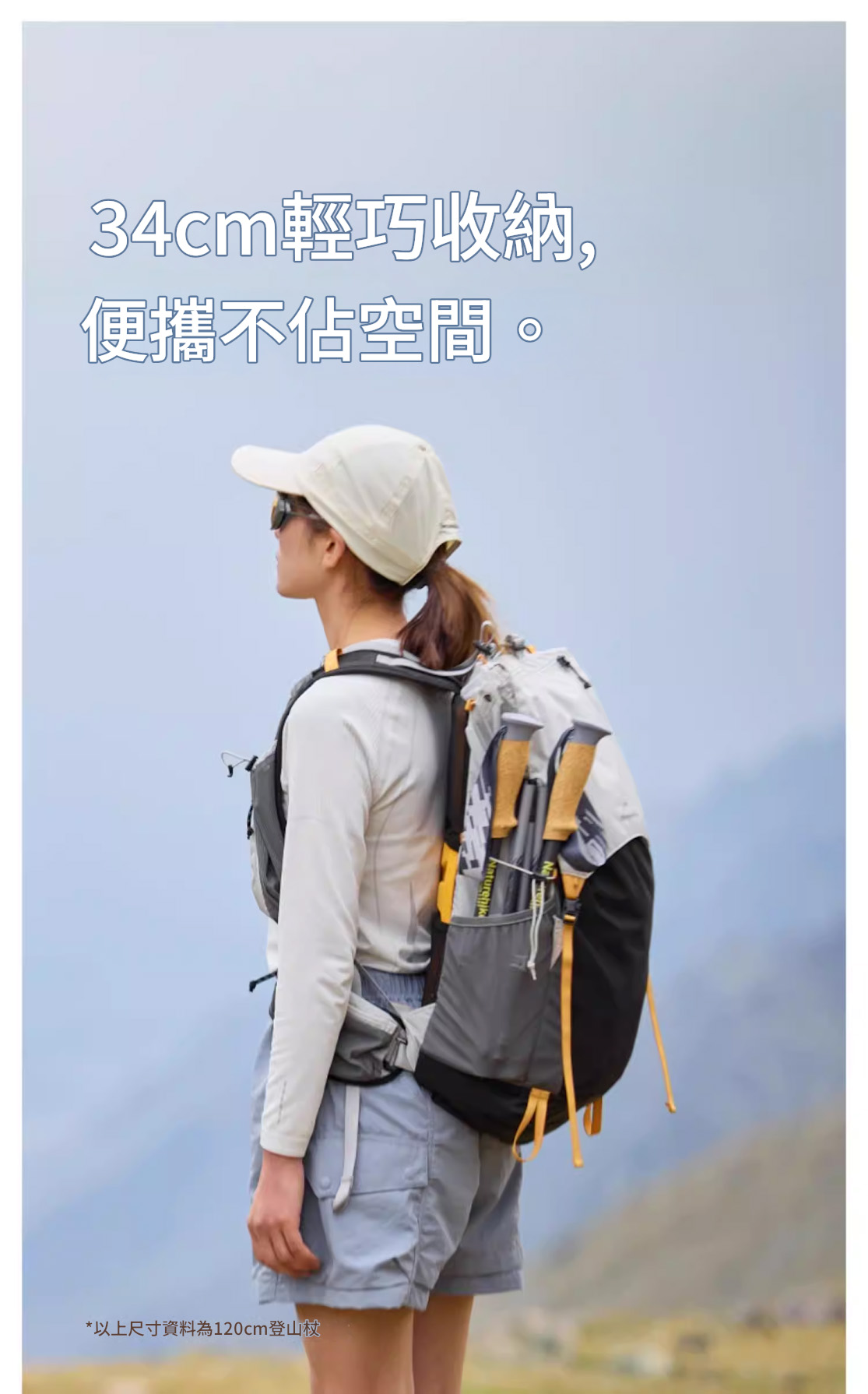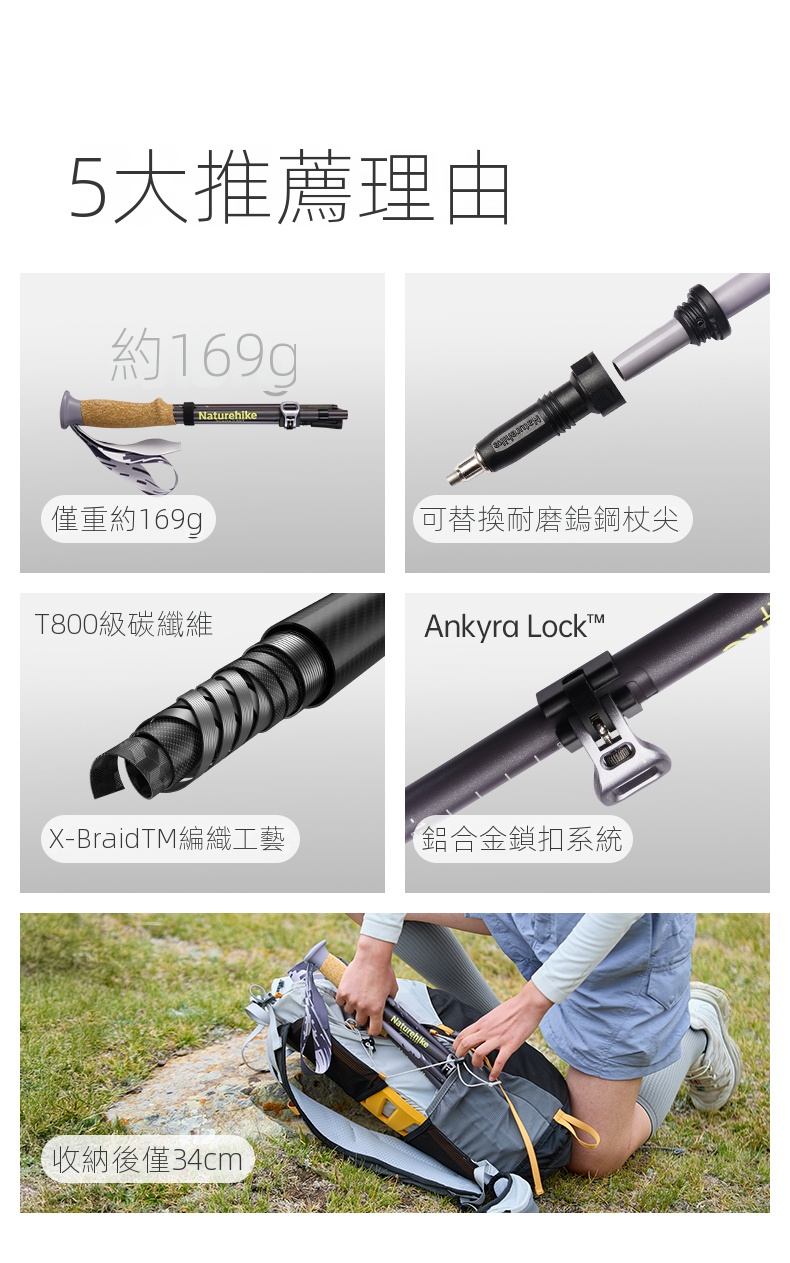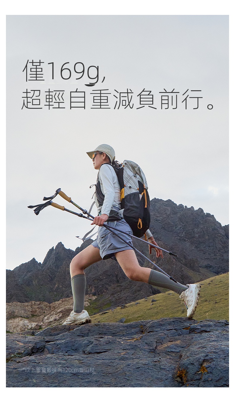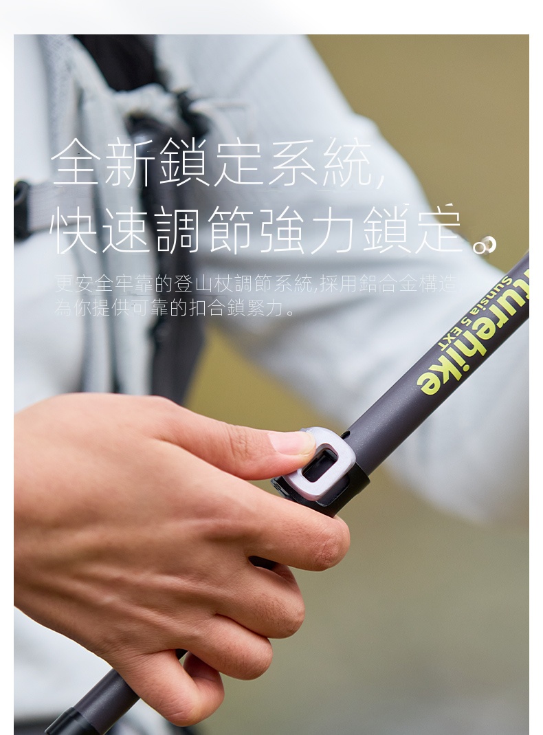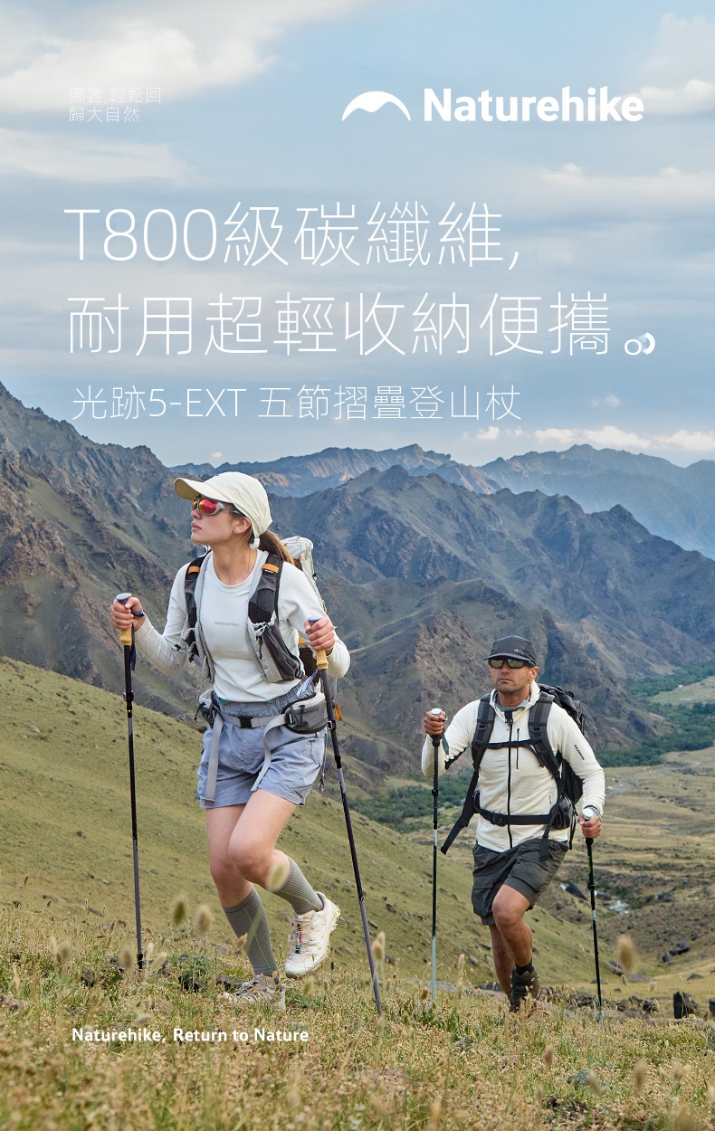 Naturehike 光跡5-EXT五節碳纖維摺疊登山杖,採用T800級碳纖維與X-Braid™編織工藝,輕盈耐用,便攜不占空間。搭載Ankyra Lock™鋁合金鎖扣系統,快速調節、強力鎖定,承壓高達350N,穩定可靠。EVA高密度握把貼合手型,減震舒適,腕帶可替換。附贈多種配件,適用雪地、泥地、石板等多種地形,是戶外徒步的理想選擇。