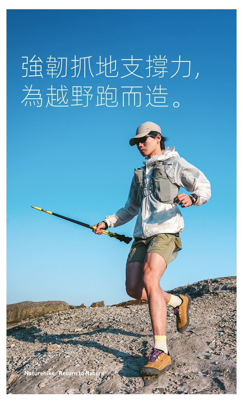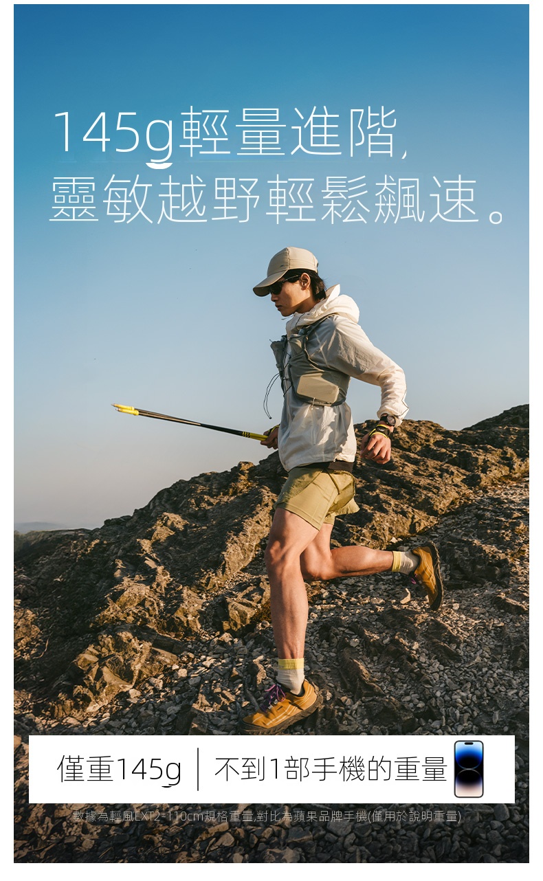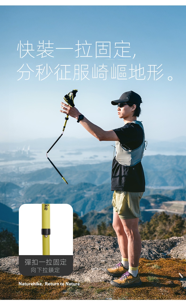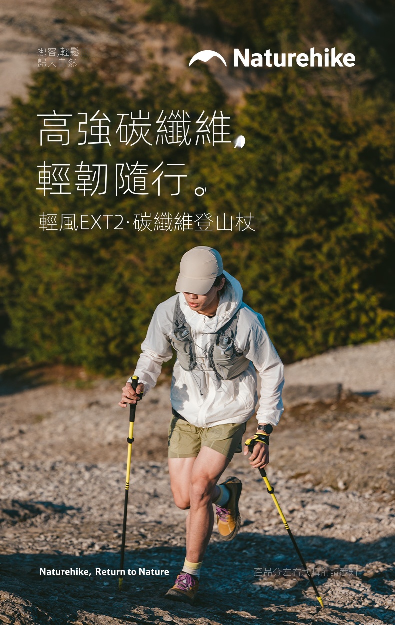 Naturehike 輕風EXT2碳纖維登山杖,採用高強度四節碳纖維設計,輕盈便攜,適合越野跑與戶外徒步,專為追求輕量化與高效能的戶外愛好者打。搭配自研防護手套與彈扣快裝系統,一拉即固定,操作快速穩定。可拆卸泥托與鈦鋼杖尖提升抓地力,適應多種地形。手柄配備魔術貼腕帶,鬆緊可調,提供舒適握感。