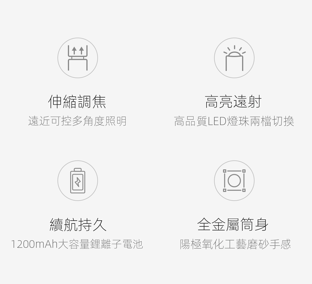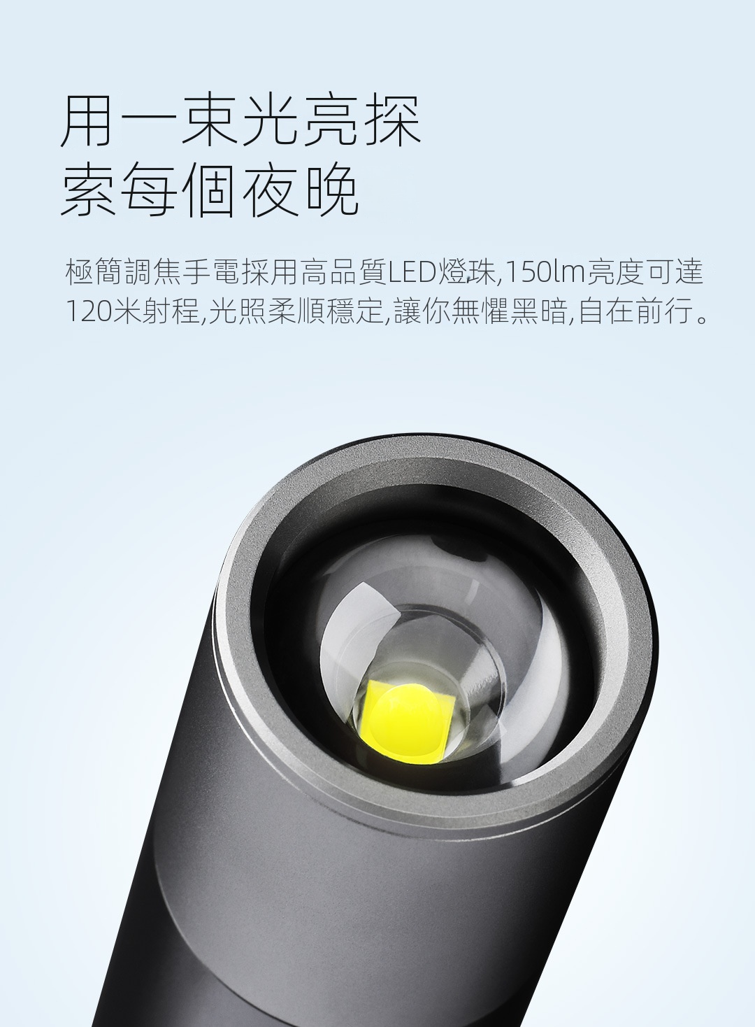 極簡變焦手電筒採用全鋁合金筒身,經陽極氧化處理,質感細膩、握持舒適。輕巧便攜的設計,長度約12cm,重量僅125g,可輕鬆收納於口袋或包包內。高品質LED燈珠提供150lm亮度,射程達120米,光照柔順穩定,讓你無懼黑暗。伸縮調焦設計讓單手輕鬆切換聚光與泛光模式,滿足多角度照明需求。底部開關一鍵操控,兩檔亮度隨心調節。內建1200mAh大容量鋰離子電池,續航持久,3小時快速充電,經濟便捷。無論是戶外露營、夜跑或居家應急,這款手電筒都是你可靠的隨身伴侶。