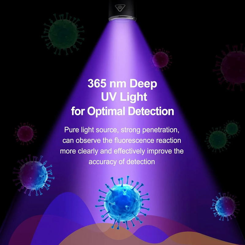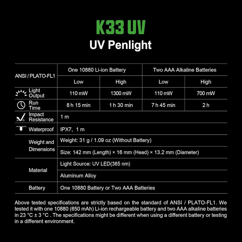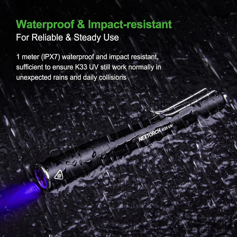 K33 UV,一款專為專業檢測與日常生活設計的紫外光筆形電筒。365nm波長的紫外線、黑鏡過濾的純正光線,1300mW的高功率光源,給你準確高效的檢測結果;無論是嚴謹的科研分析,還是日常的細節探索,K33 UV都能以精準和效率,助您一臂之力!