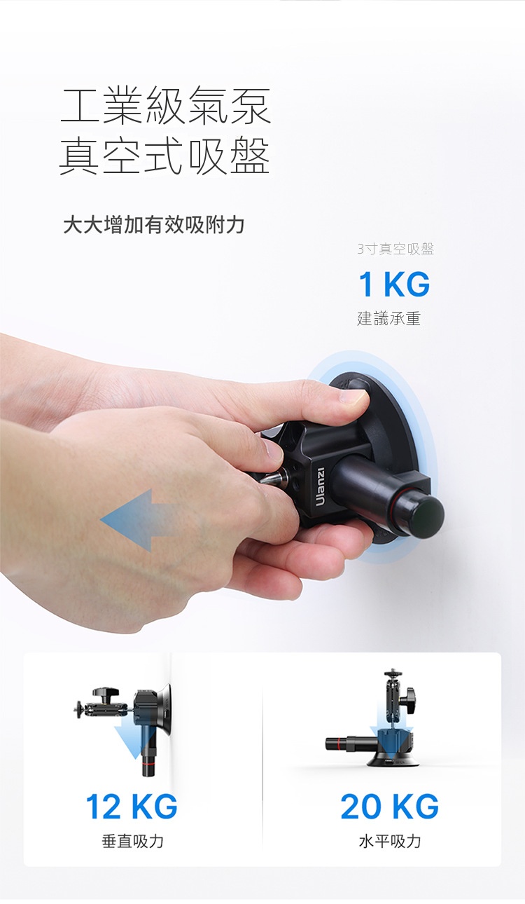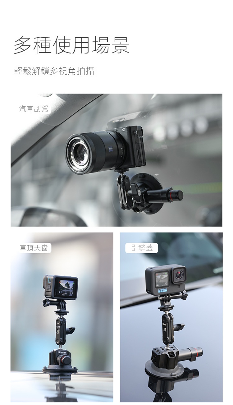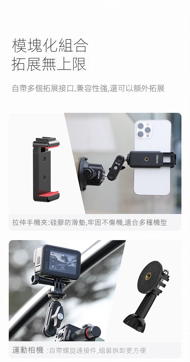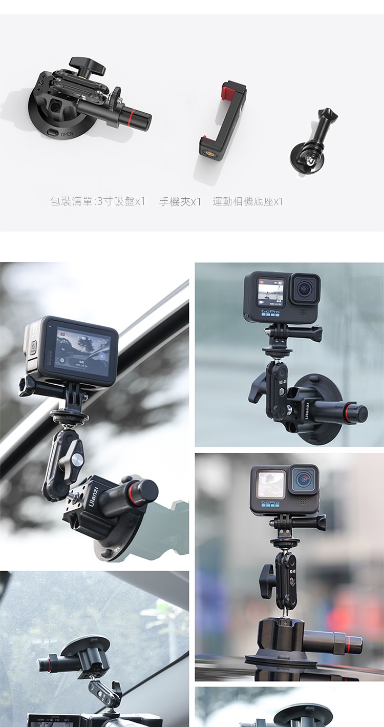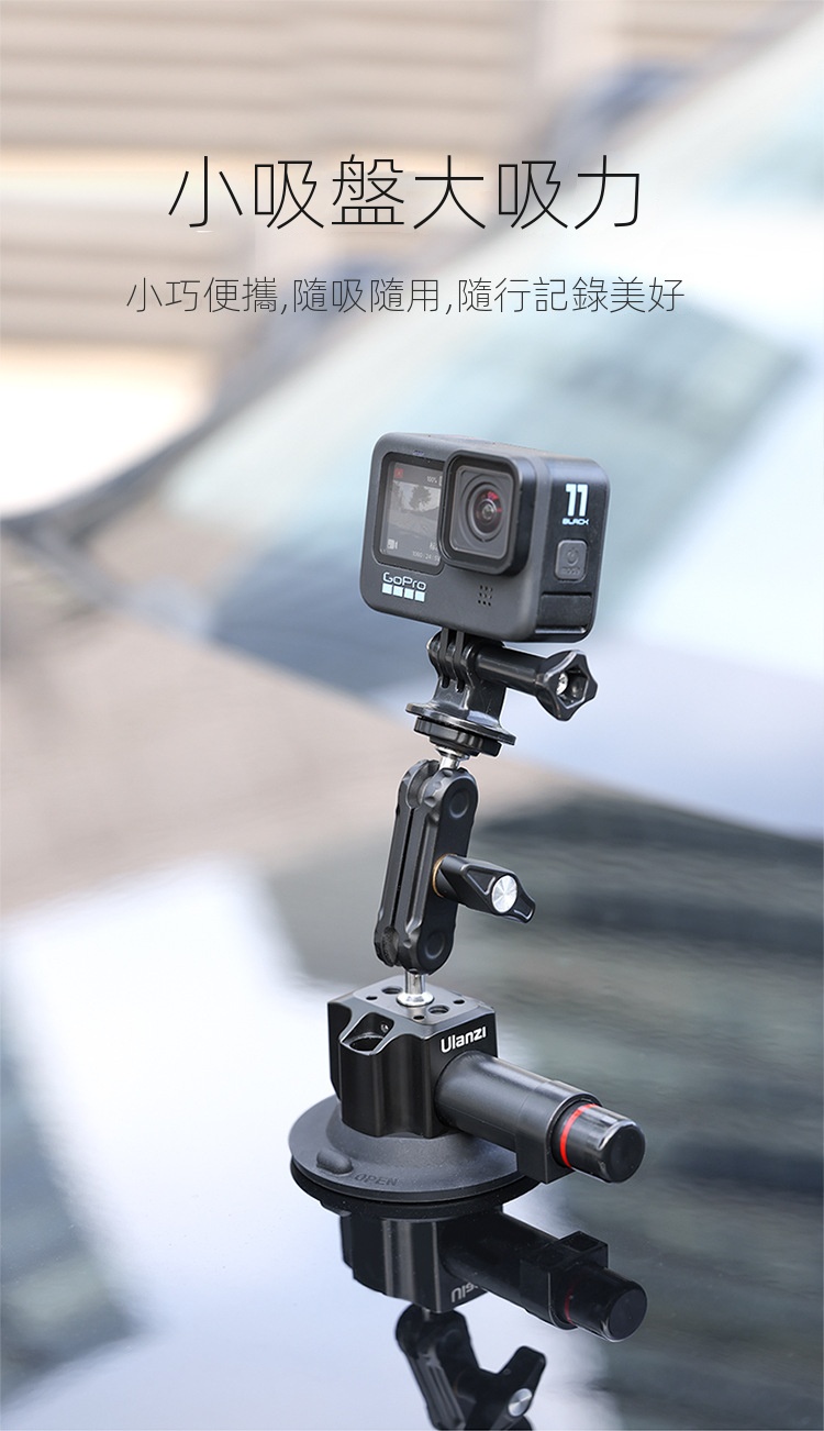 Ulanzi SC-01 3吋多拓展真空吸盤,是一款便利實用的拍攝輔助工具。它採用真空吸附原理,吸力強勁,能穩定吸附在車窗、玻璃等平滑表面,建議承重1kg,可滿足手機、運動攝影機等設備的拍攝需求。其自備手機夾與gopro轉接接頭,方便不同裝置安裝。而且具備多拓展功能,為攝影愛好者在車載拍攝、戶外記錄等場景中,提供了靈活多樣的拍攝角度選擇,解放雙手,助力輕鬆捕捉精彩瞬間 。